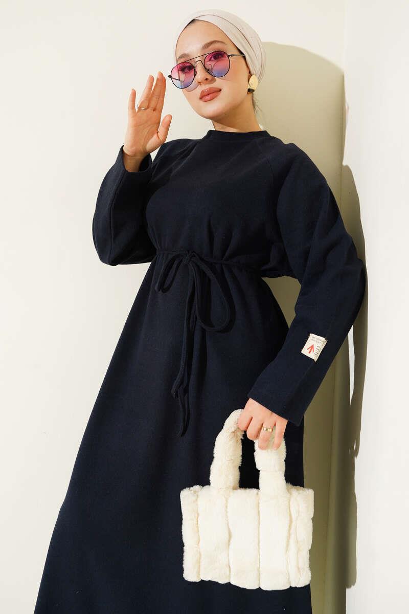 Bisiklet Yaka Armalı İp Kuşaklı Elbise Lacivert (0582-13092-677815)