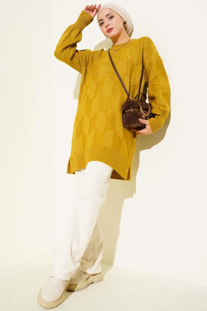 Bisiklet Yaka Yumoş Yan Yırtmaçlı Triko Tunik Yağ Yeşili (0829-7017-686215)