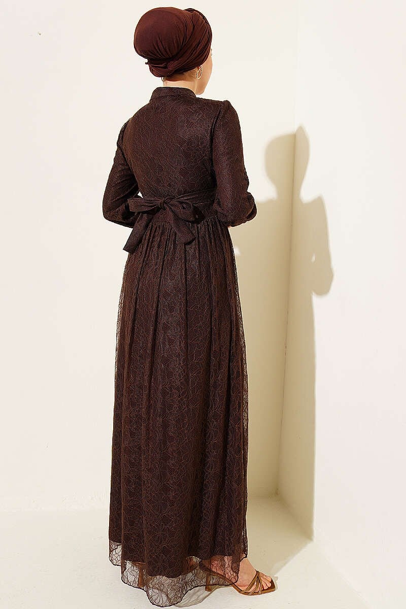 Brit Düğmeli Dantelli Abiye Elbise Kahve (0999-6822-749099)