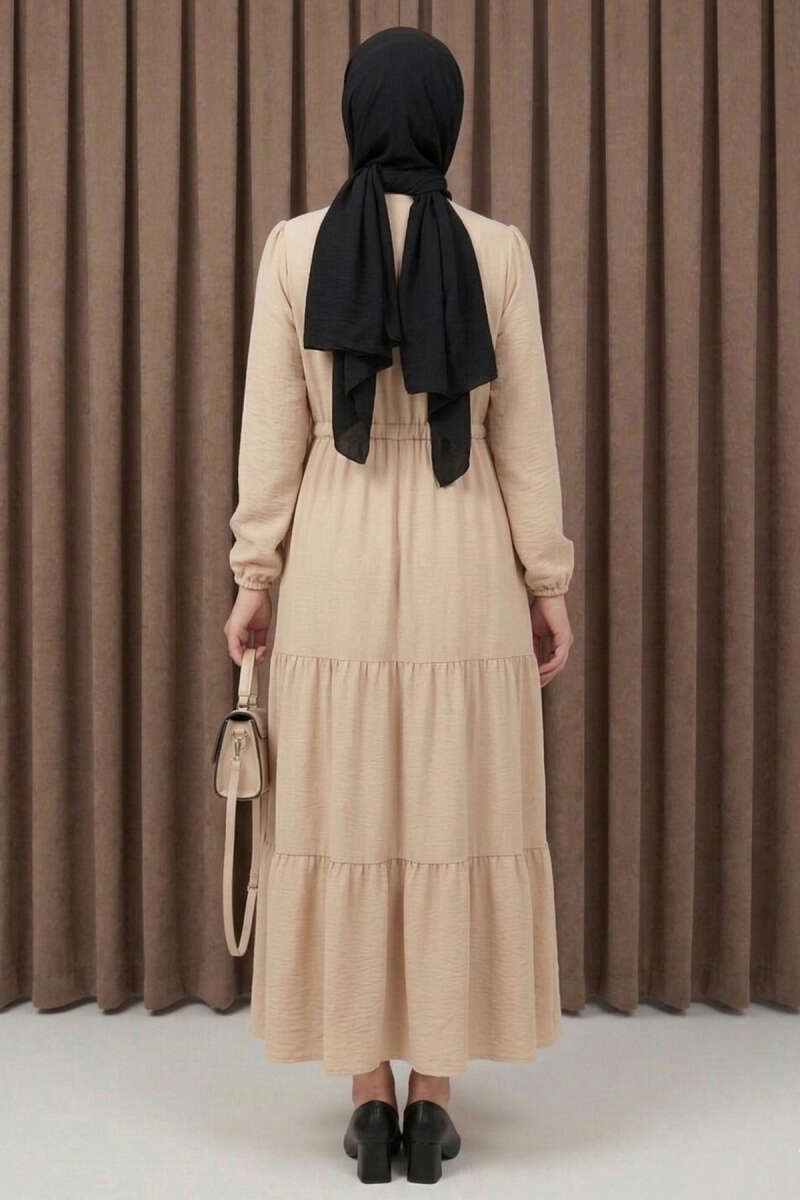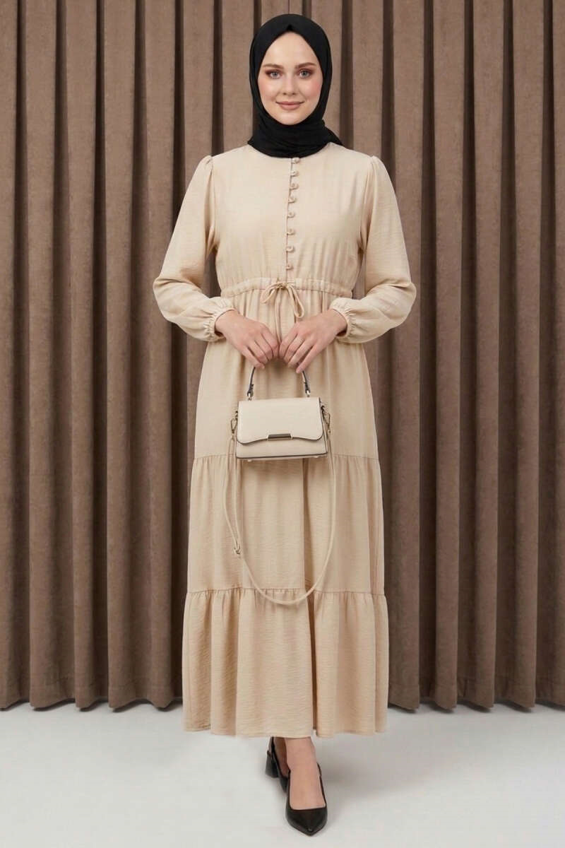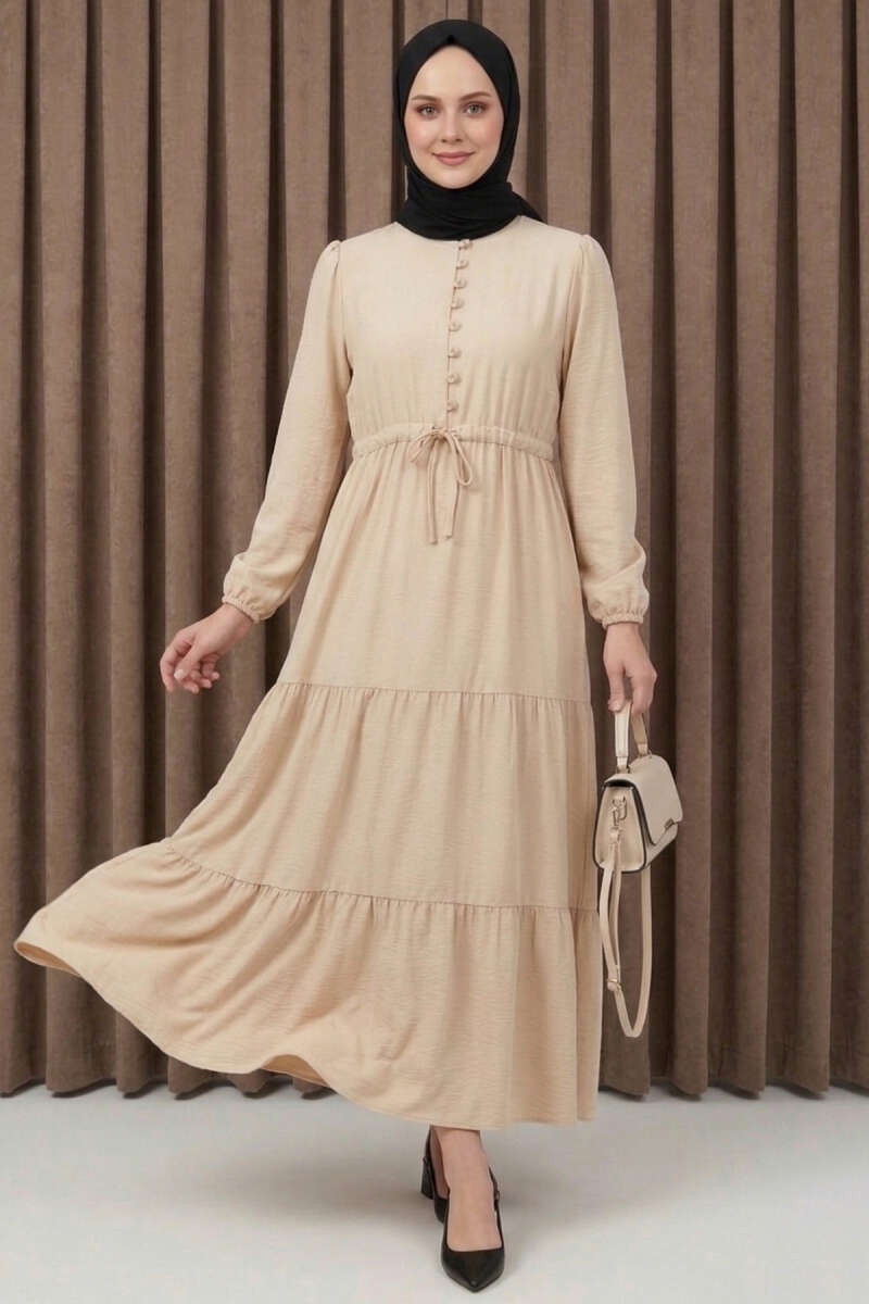 Brit Düğmeli Katlı Elbise Bej (0674-2406-734815)