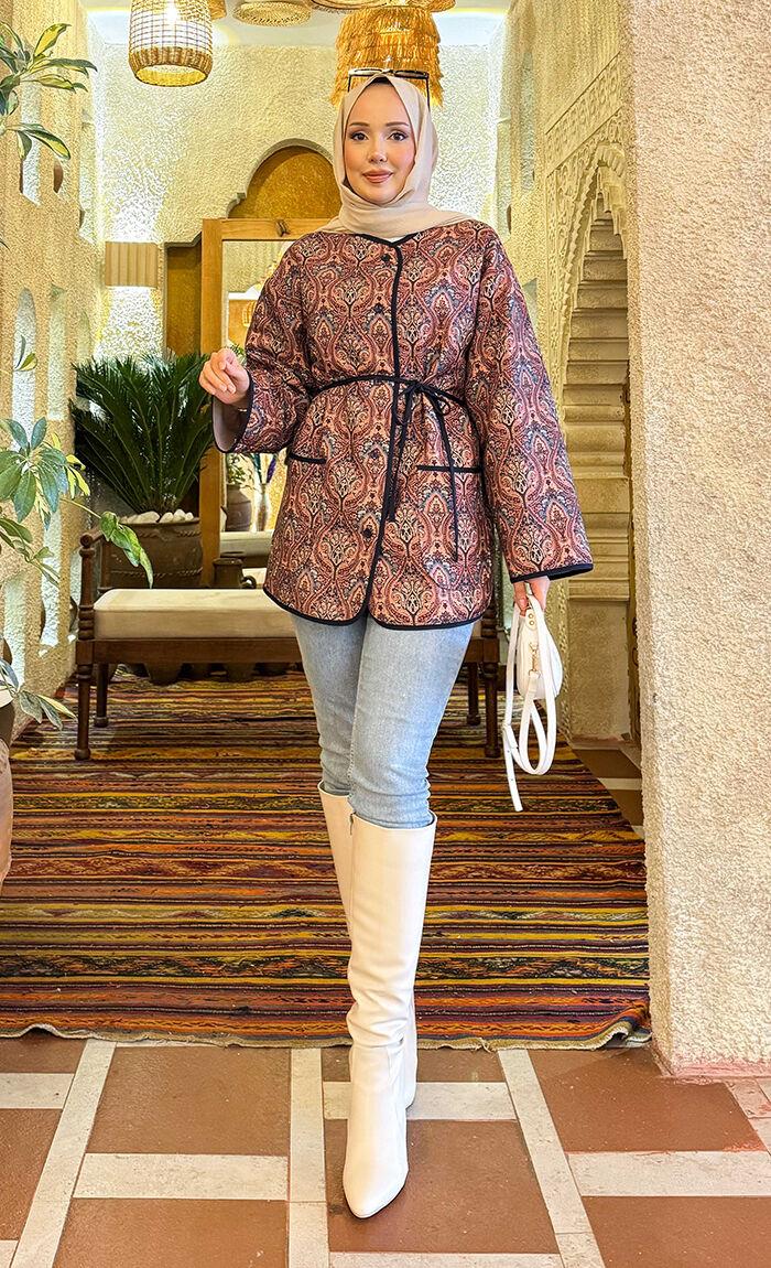 • Ürün Sonbahar & Kış modasıdır. Seyyar kemerli çift cep detaylı boydan düğmeli bohem kapitone ceket.