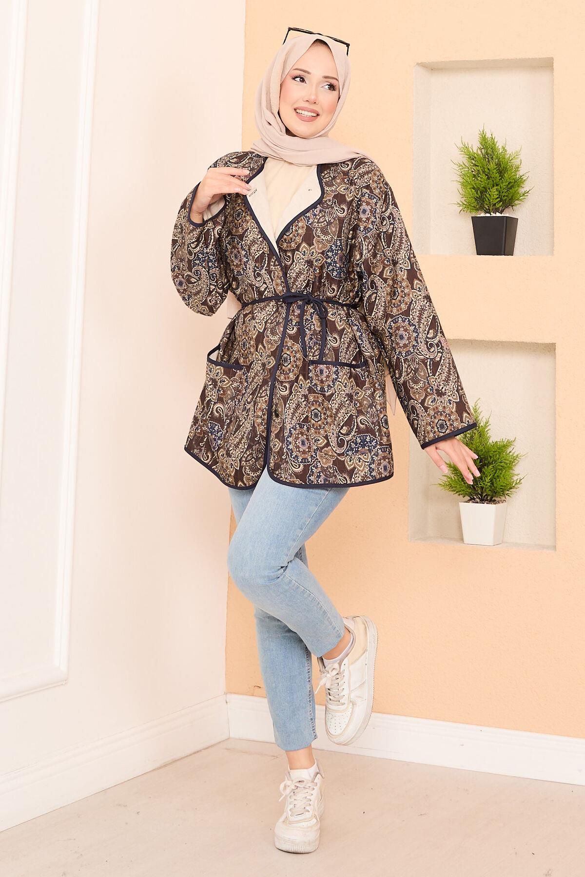 • Ürün Sonbahar & Kış modasıdır. Seyyar kemerli çift cep detaylı boydan düğmeli bohem kapitone ceket.