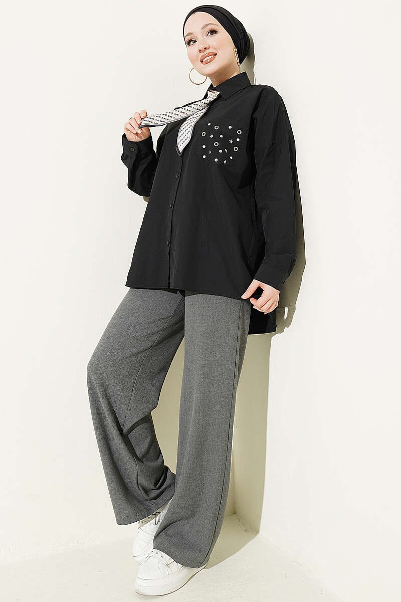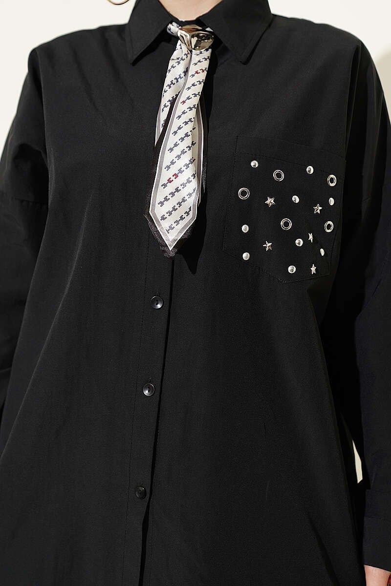 Klasik gömlek formuna modern bir dokunuş katan bu tasarım, göğüs kısmındaki zımba ve taş detaylı cep tasarımıyla fark yaratır. Oversize kesimi ve düşük omuz yapısı sayesinde hem rahat bir kullanım sunar hem de çabasız bir şıklık vadeder. Boydan düğmeli yapısı ve kaliteli kumaş dokusuyla günlük kombinlerinize dinamik bir hava katarken, farklı alt giyim parçalarıyla kolayca uyum sağlar.