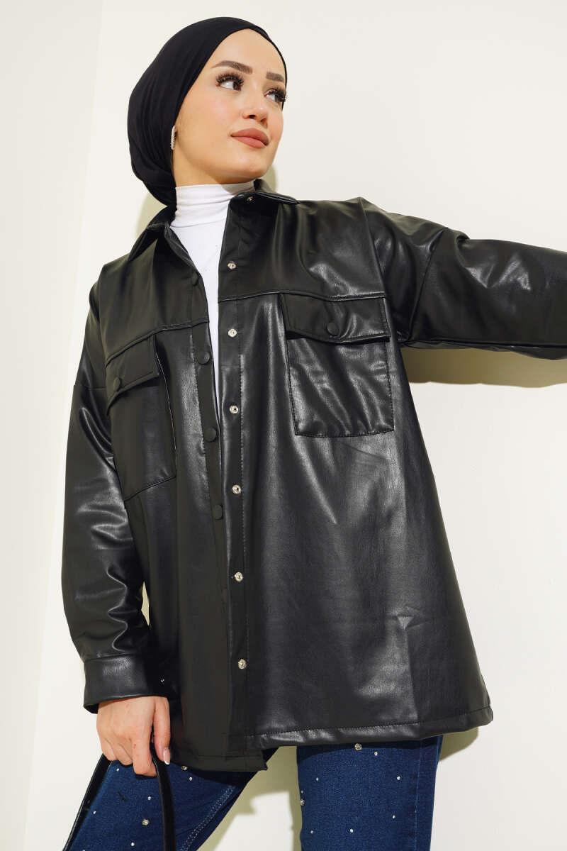 Çift Göğüs Cepli Deri Gömlek Siyah (8911-3643-579487)