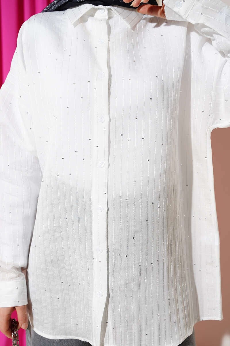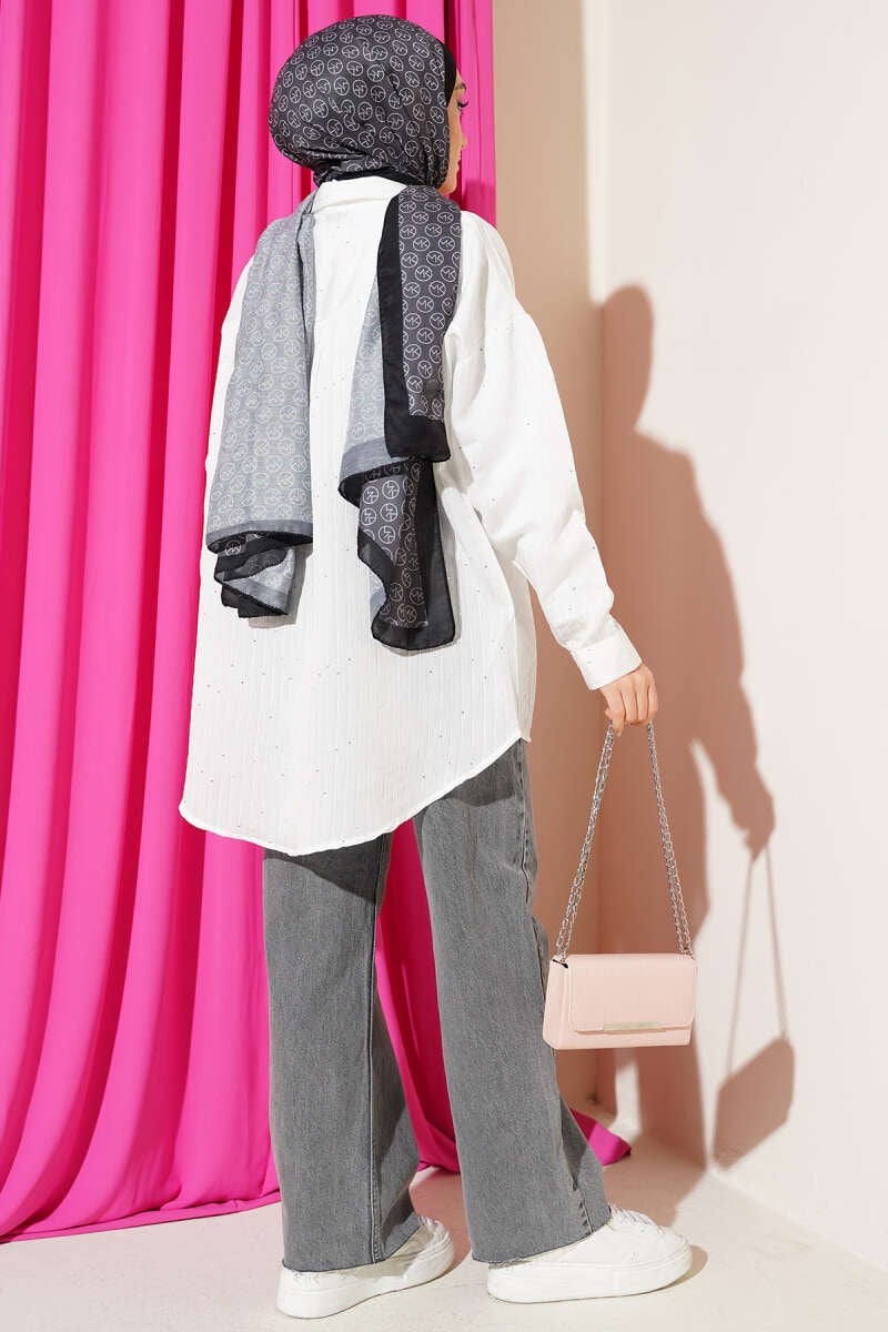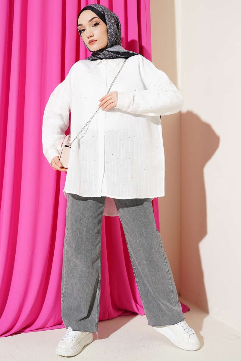 Bu oversize gömlek, boyuna uzanan çizgi dikişleri ve yüzeyine zarifçe serpiştirilen pul detaylarıyla klasik tasarıma ışıltılı bir modernlik katıyor. Geniş ve dökümlü kesimi sayesinde gün boyu konforlu bir kullanım sunarken, klasik yaka ve boydan düğmeli yapısı şıklığı tamamlar. Hem denim pantolonlarla sportif, hem de kumaş pantolonlarla daha sofistike bir görünüm yakalamanıza olanak sağlayan bu parça, gardırobunuzun en dinamik üyelerinden biri olmaya adaydır.