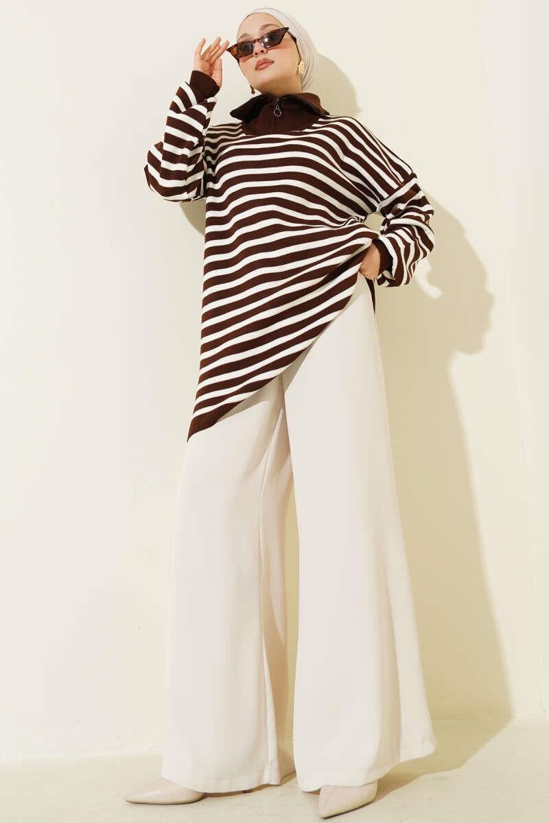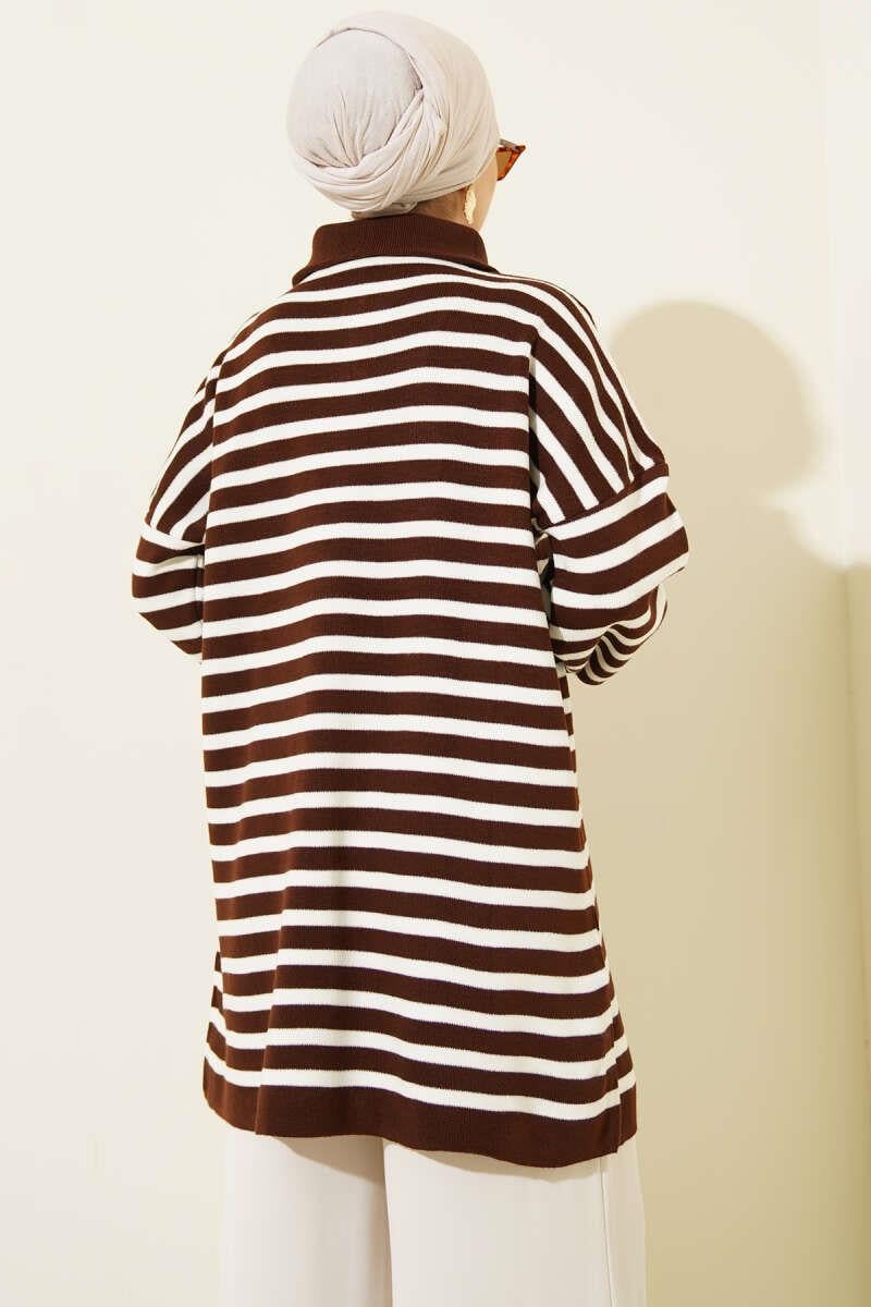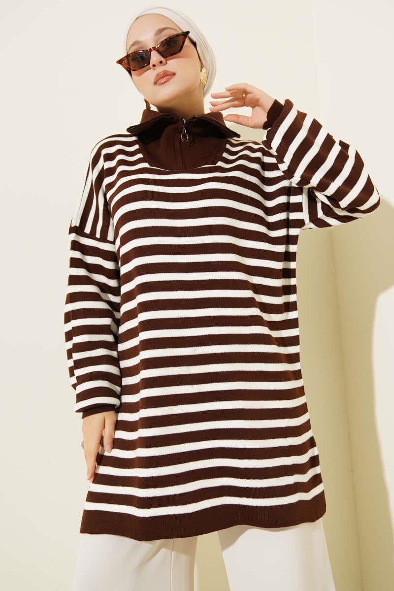 Çizgili Yarım Fermuarlı Triko Tunik Kahve (0589-3-24-674814)