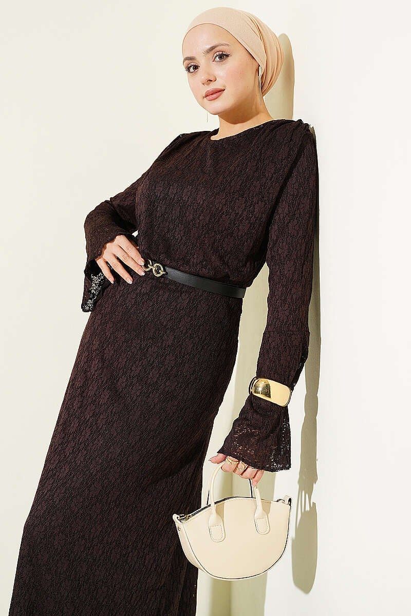 Dantelli Kemerli Elbise Kahve (0853-5311-742757)