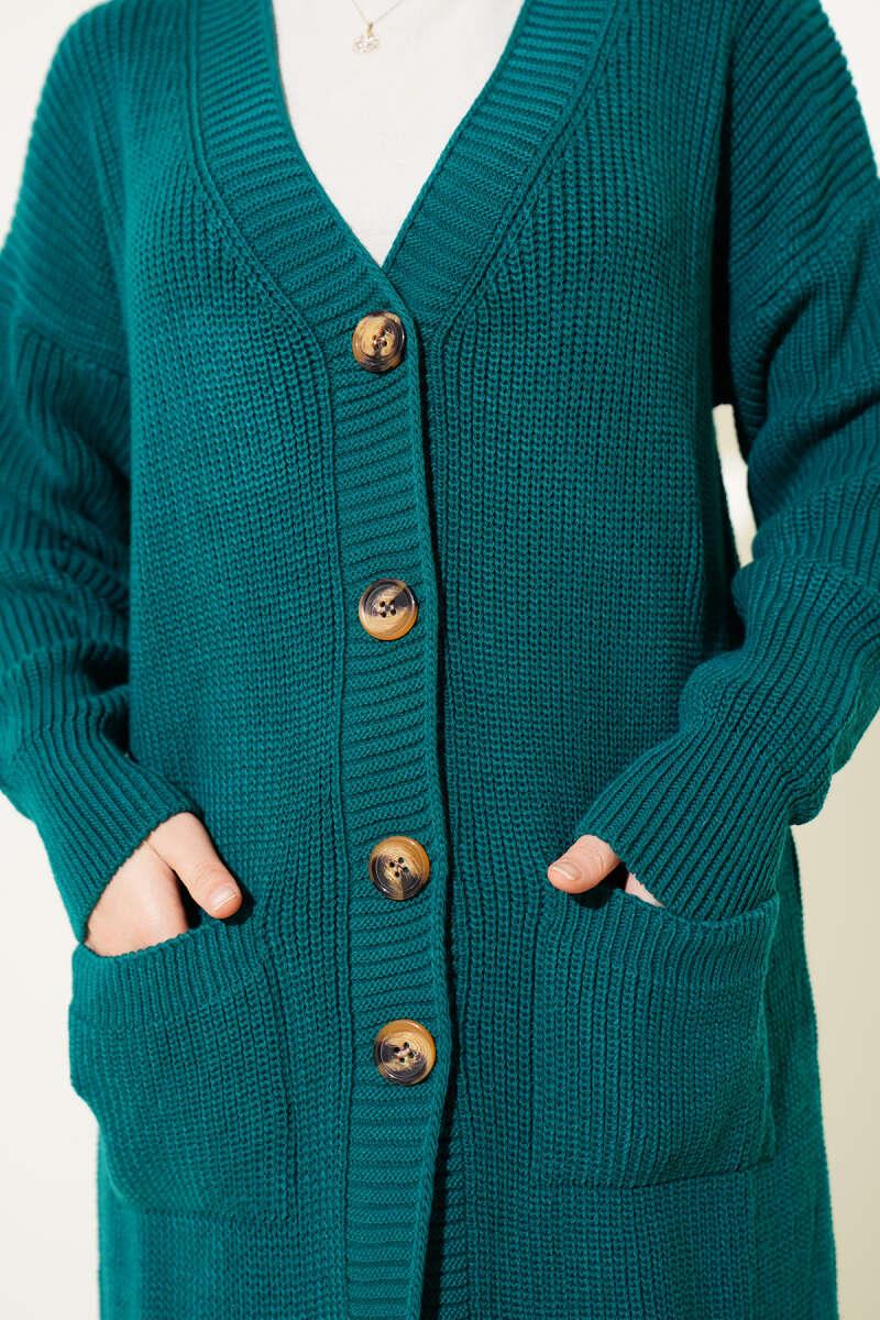 Düğmeli Cepli Uzun Triko Hırka Zümrüt (0875-2892-669762)