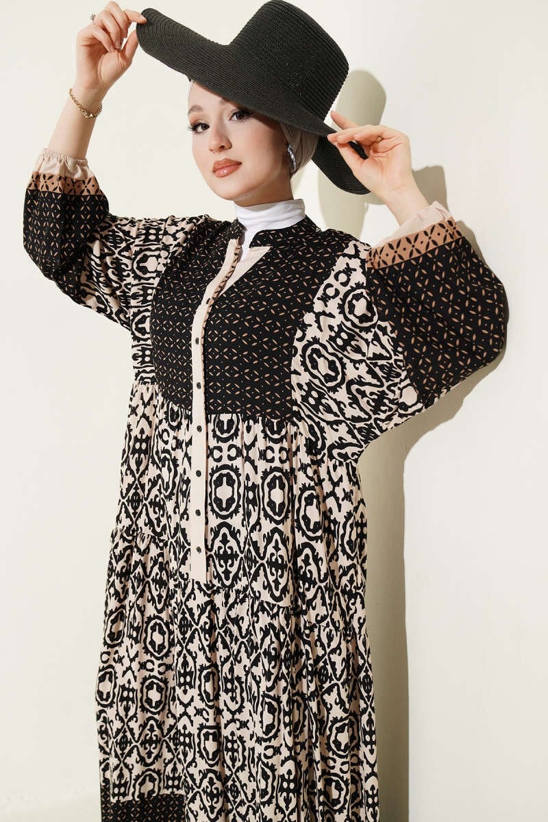 Düğmeli Etnik Desenli Katlı Elbise Bej (0820-2590-30-727399)