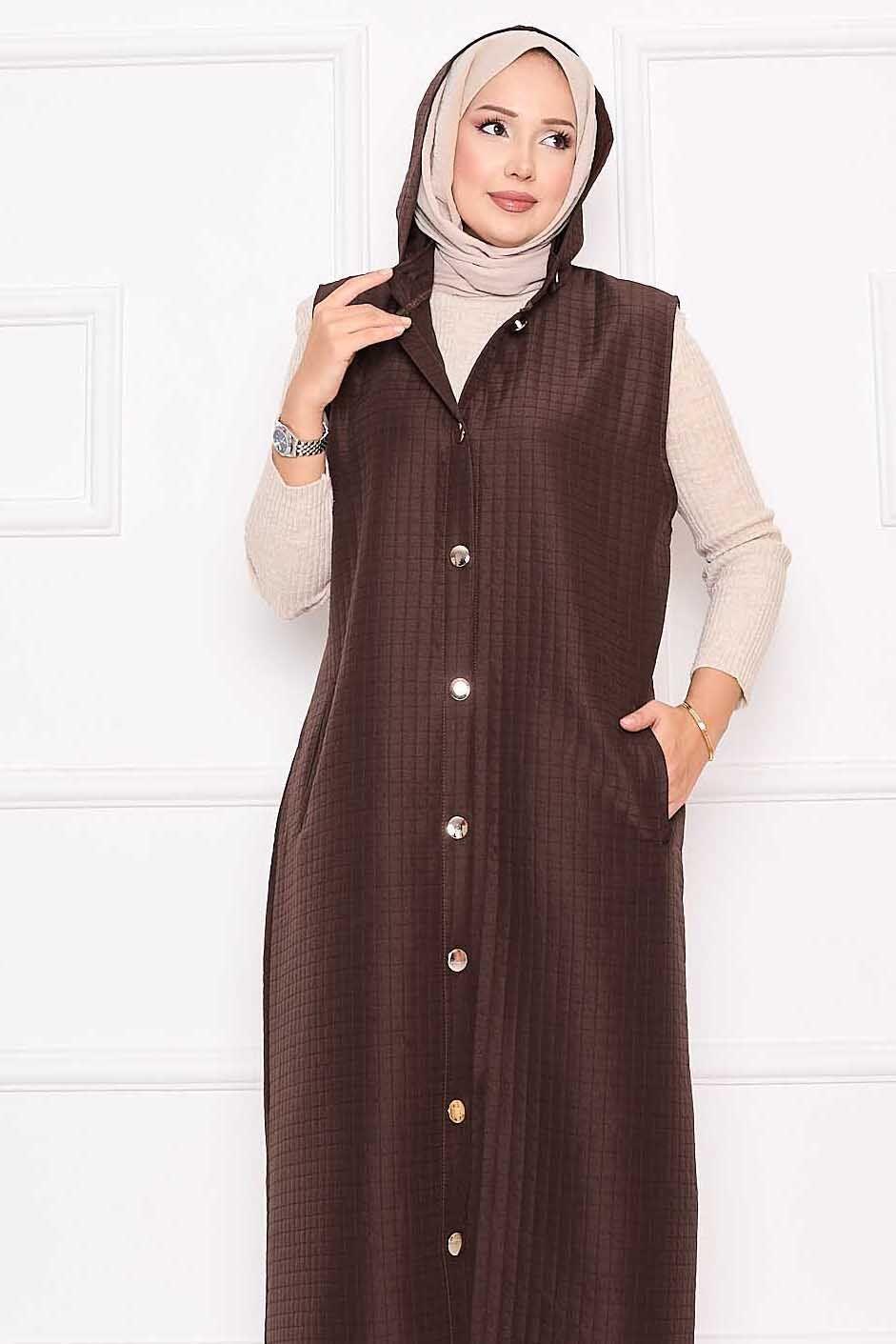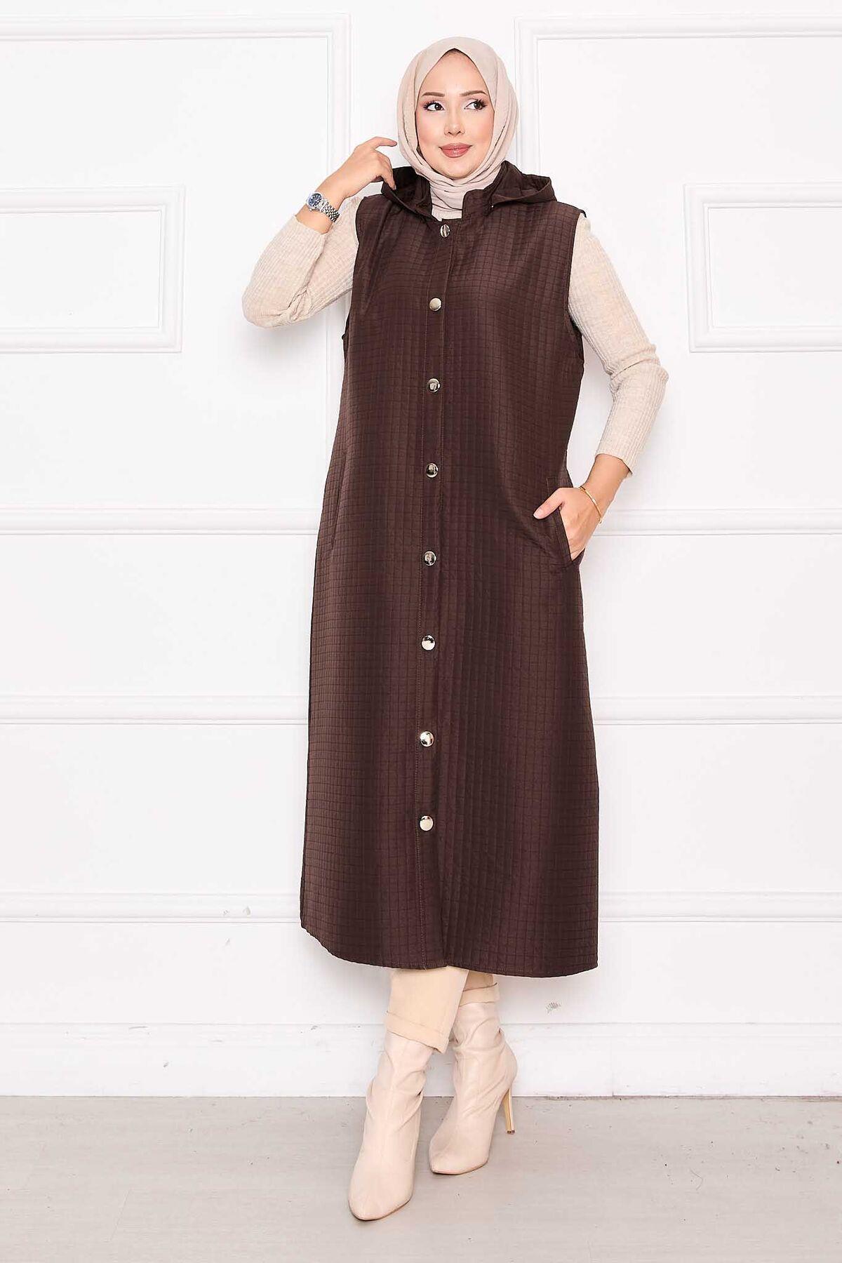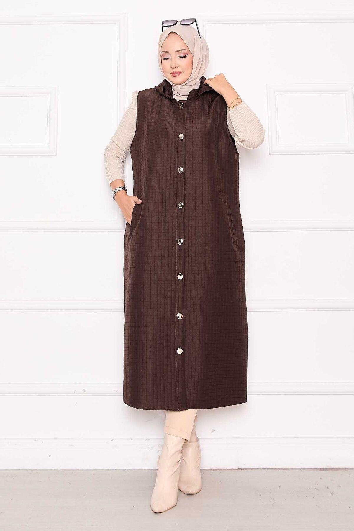 Düğmeli & Kapüşonlu Uzun Kapitone Yelek Kahve (125M00913285R2540)