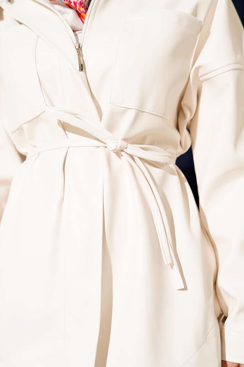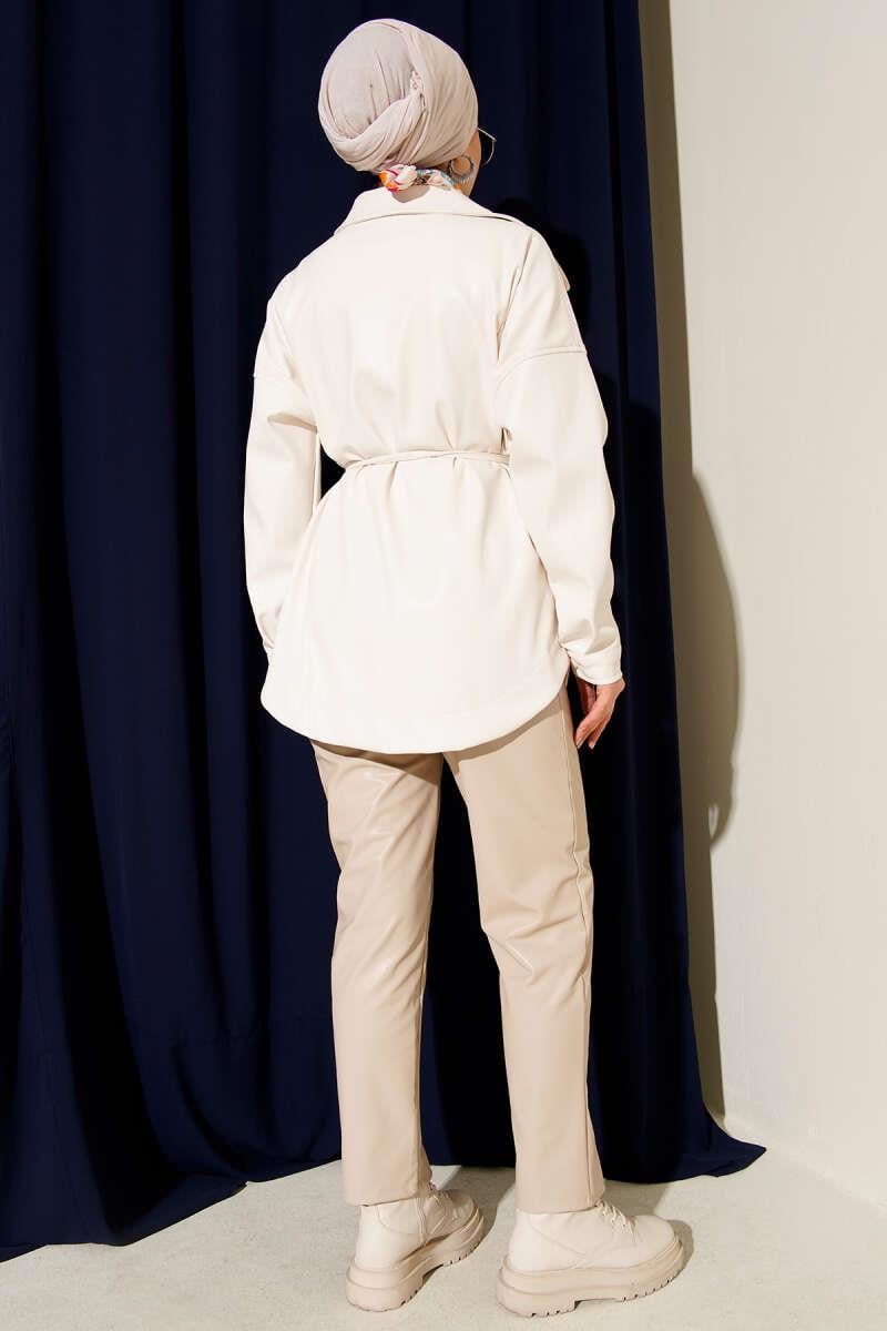 Gömlek Yaka İp Kuşaklı Deri Ceket Ekru (0999-6388-679113)