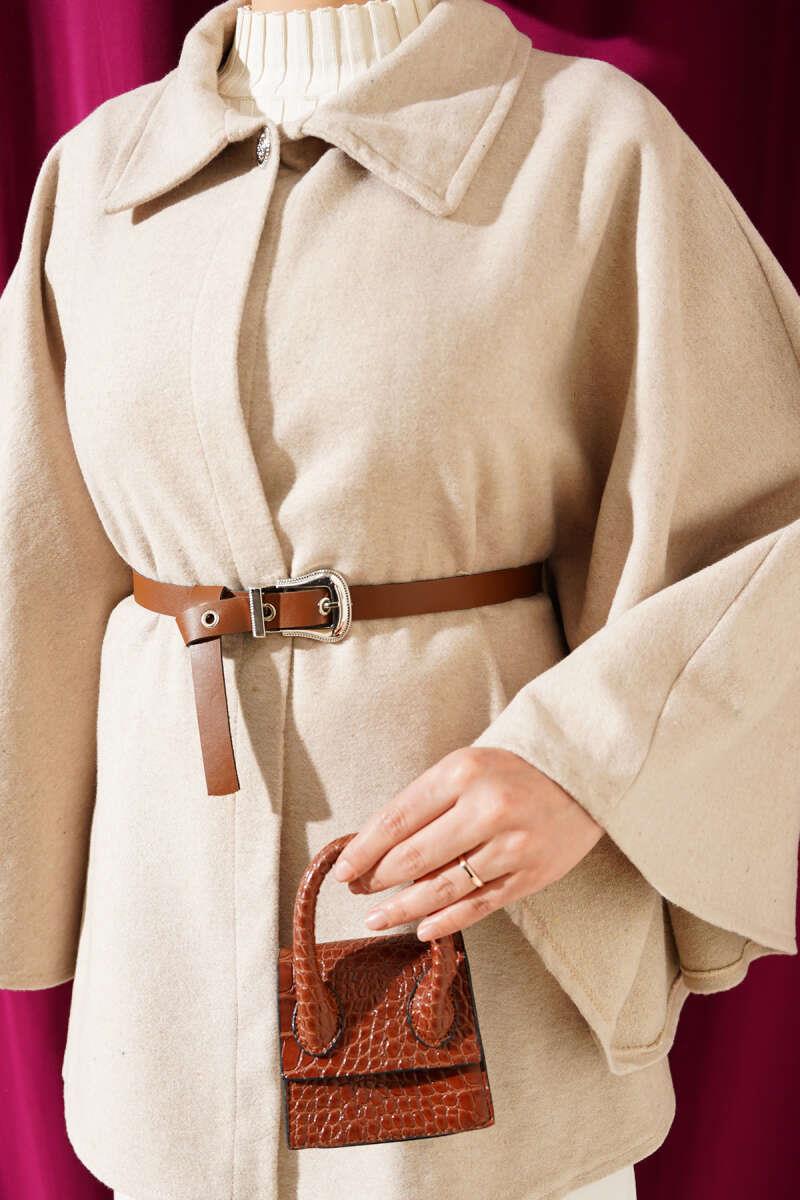 Gömlek Yaka Kemerli Kaşe Panço Bej (0319-6070-592909)
