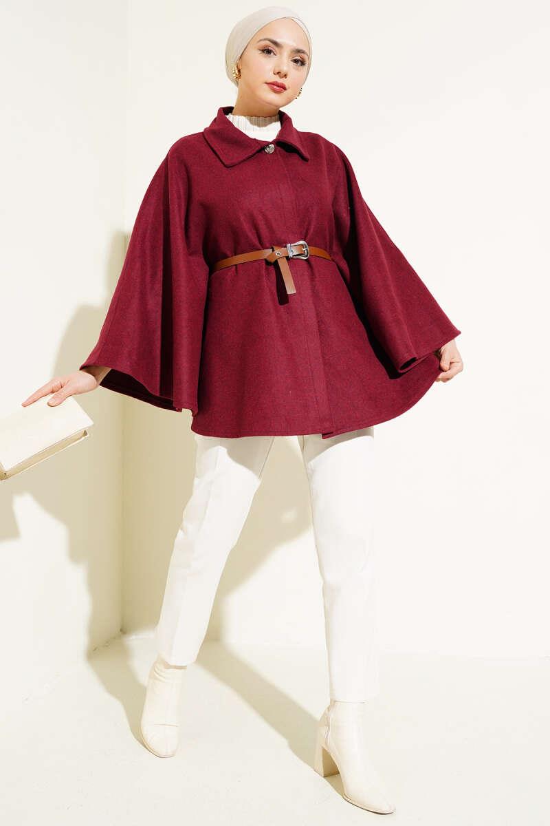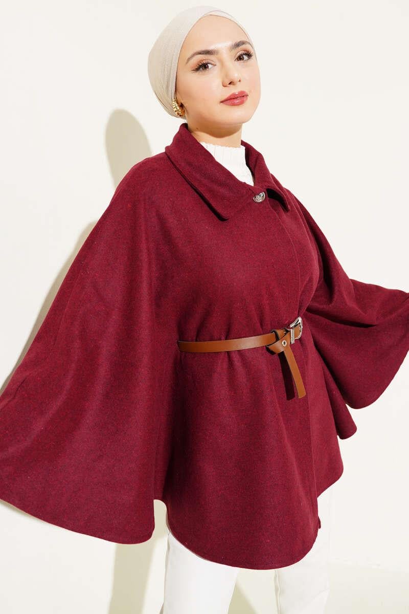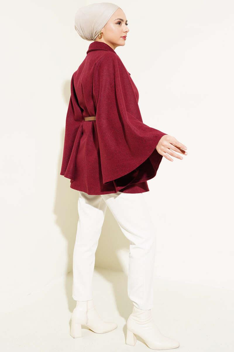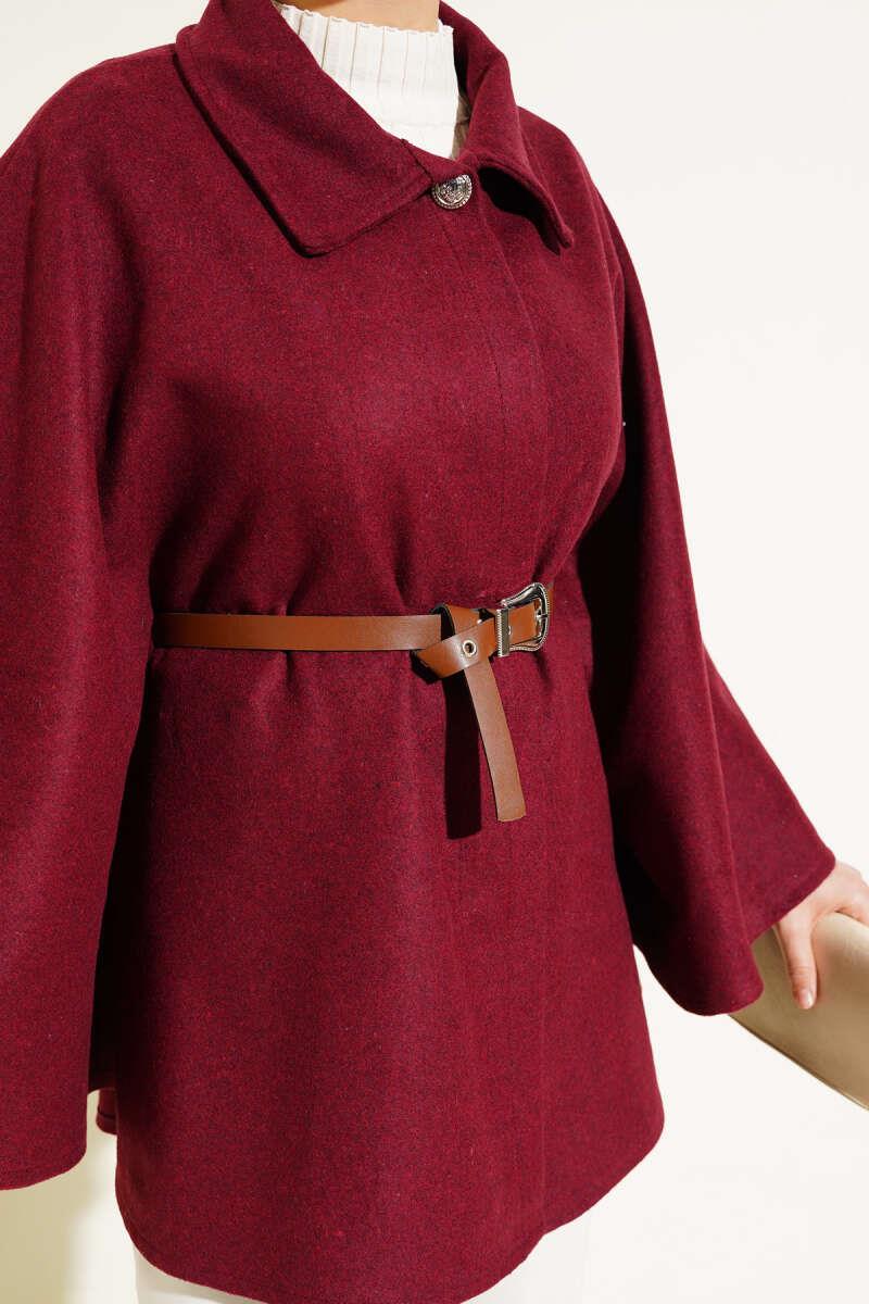 Gömlek Yaka Kemerli Kaşe Panço Bordo (0319-6070-592910)