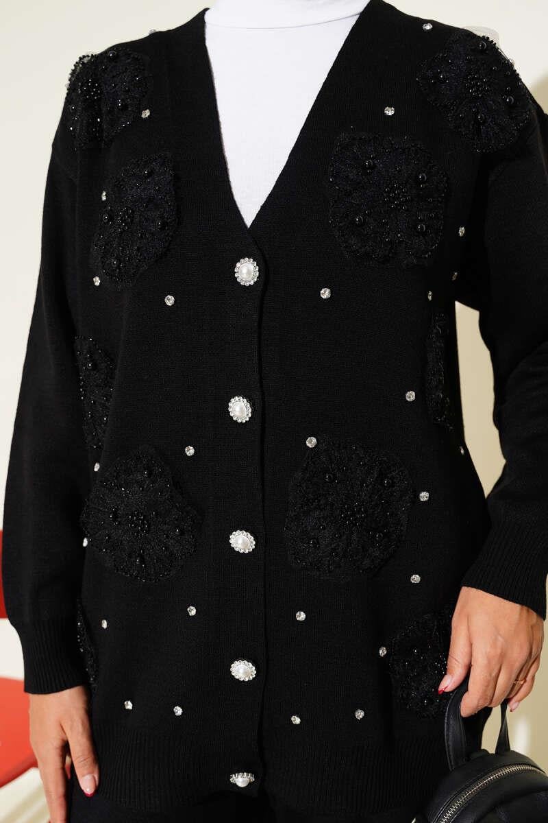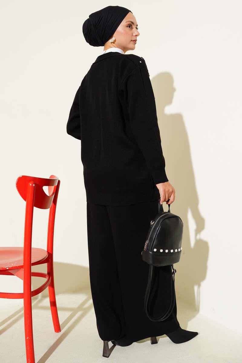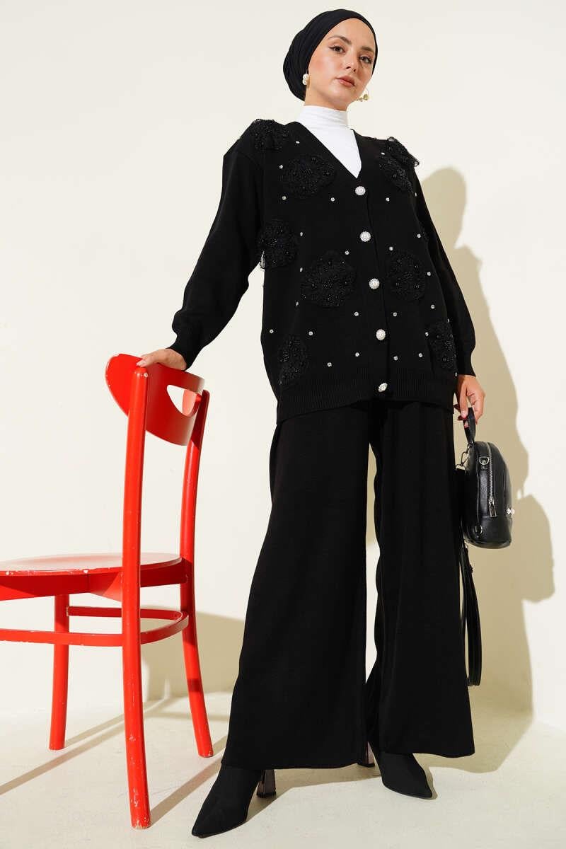İnci Çiçek Detaylı İkili Triko Takım Siyah (0853-3155-672698)