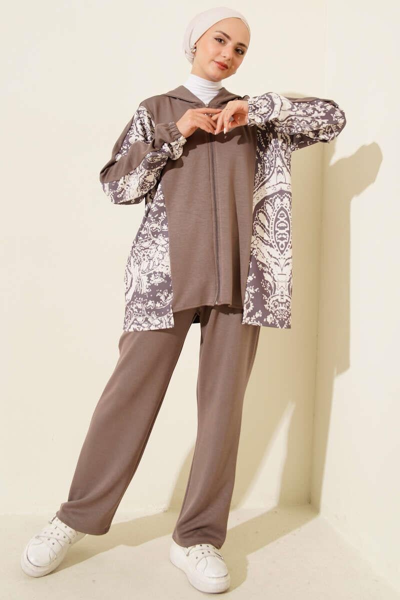 Karışık Desenli Fermuarlı İkili Takım Vizon (0026-3233-689372)