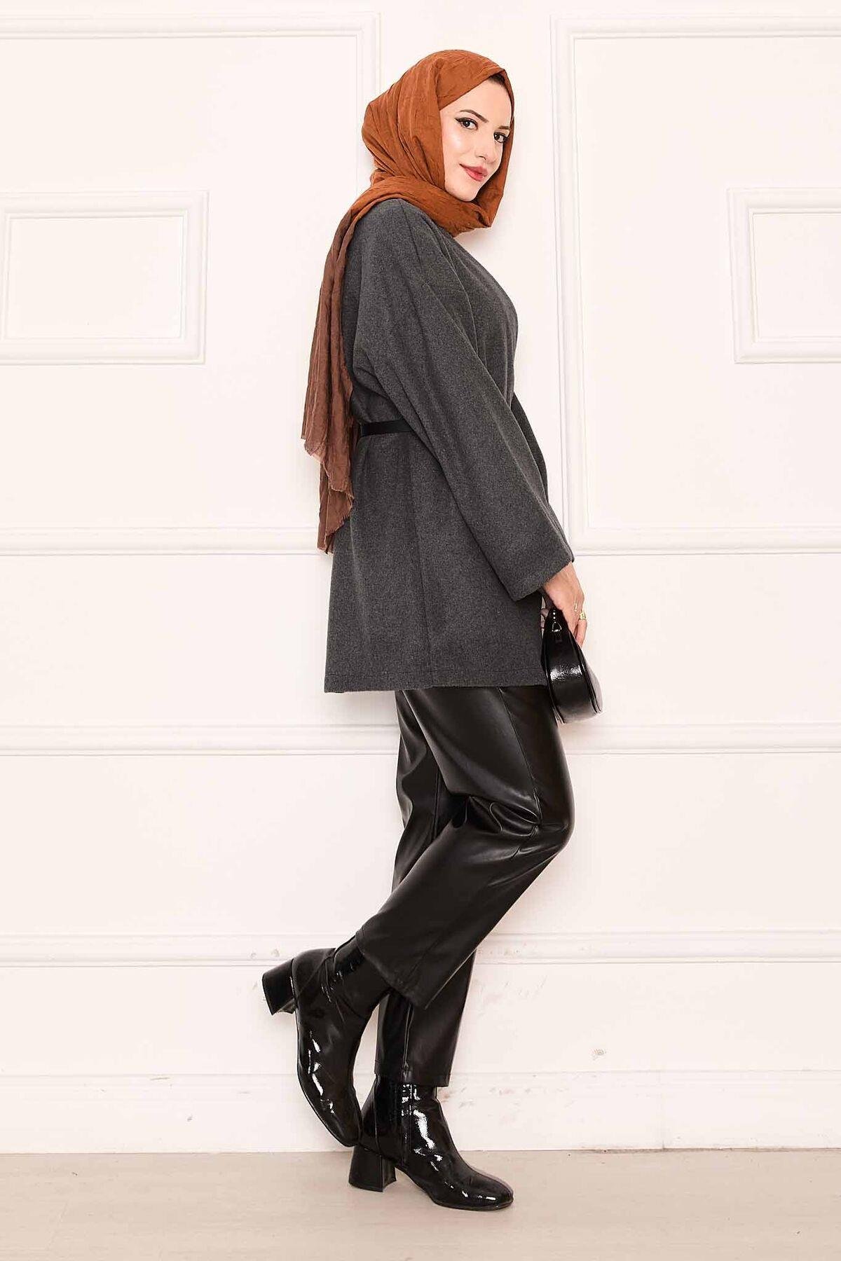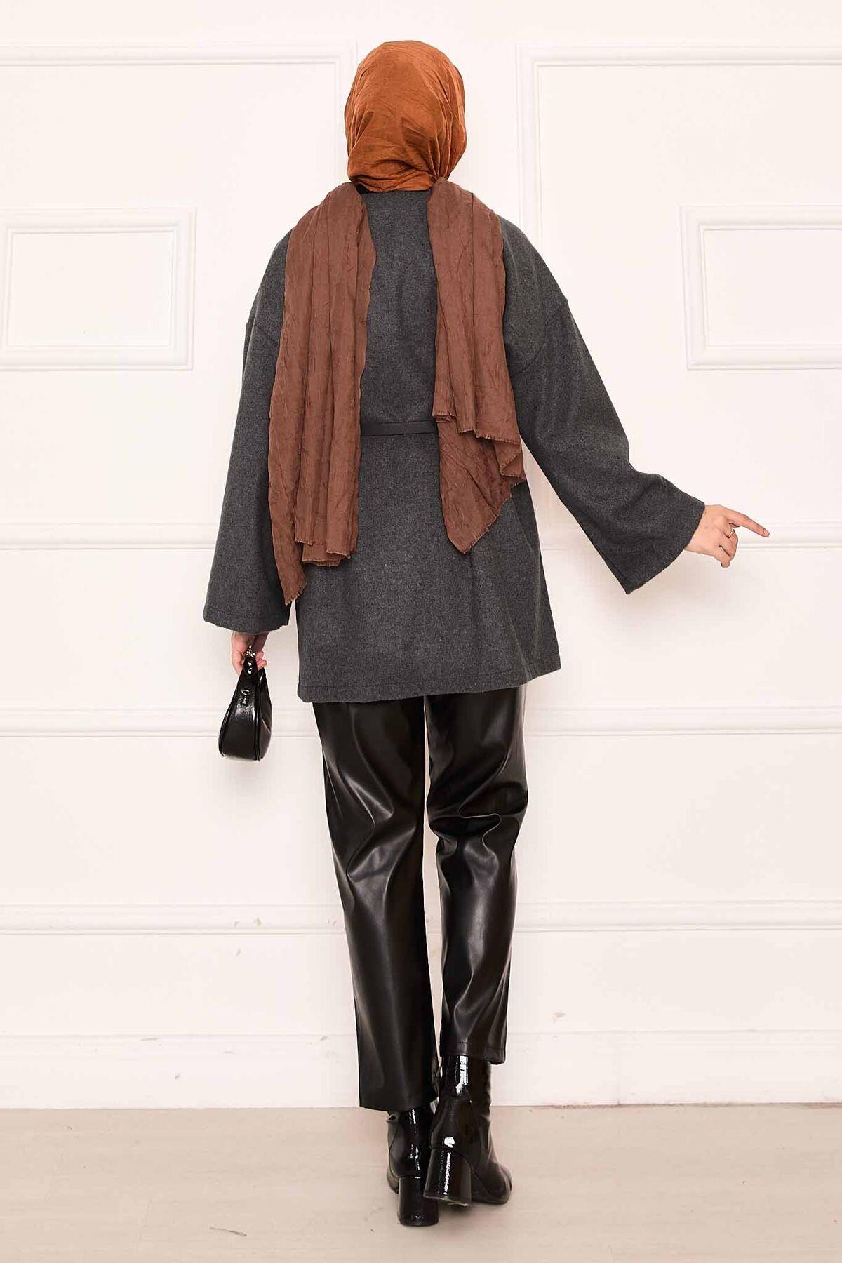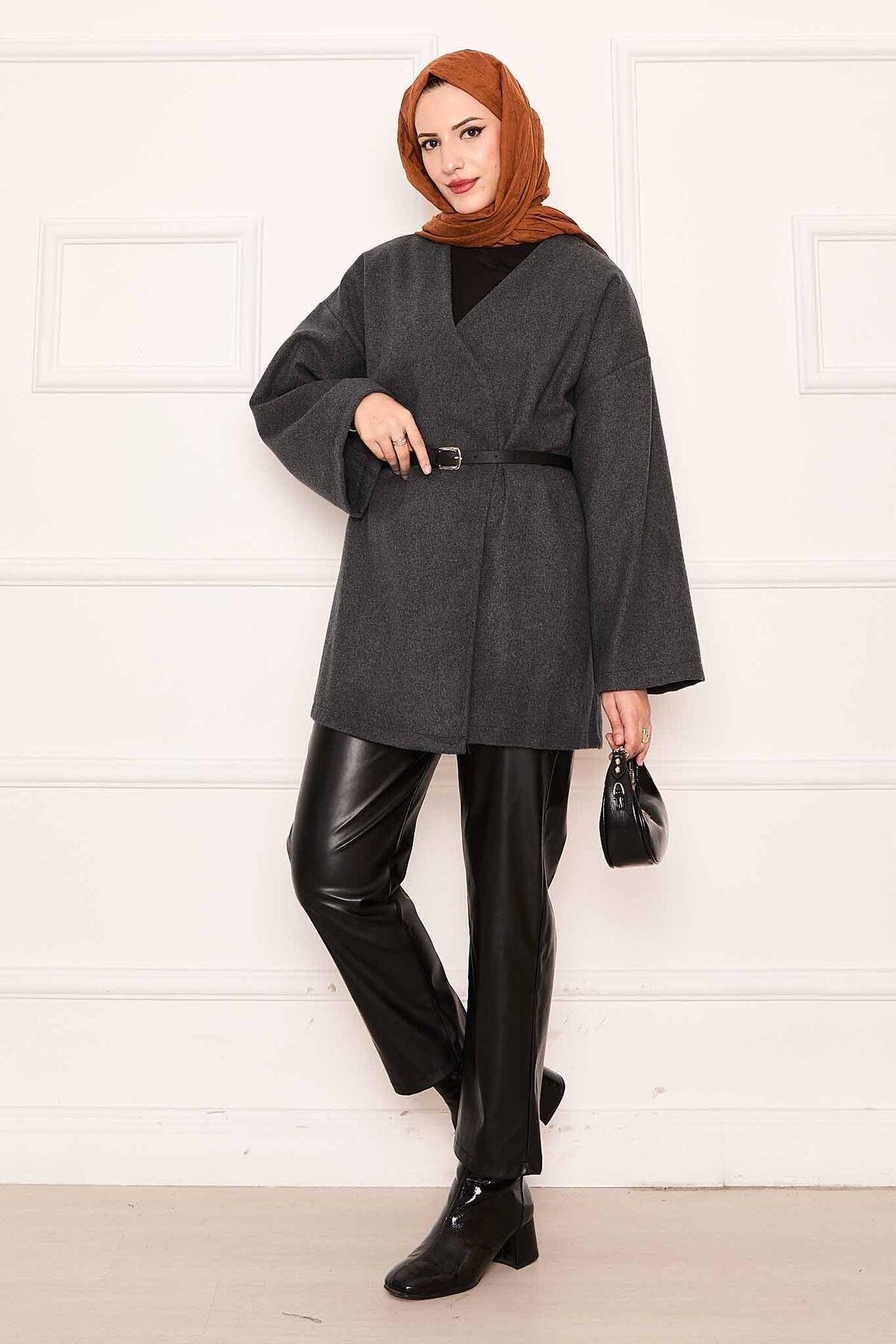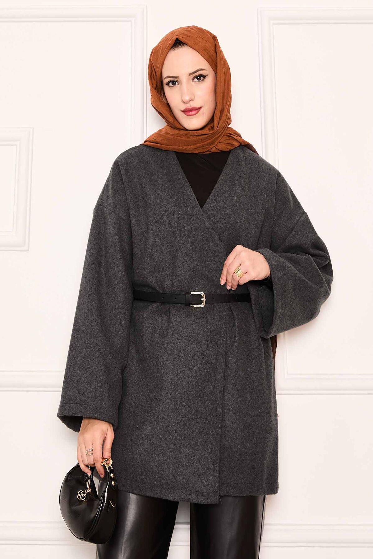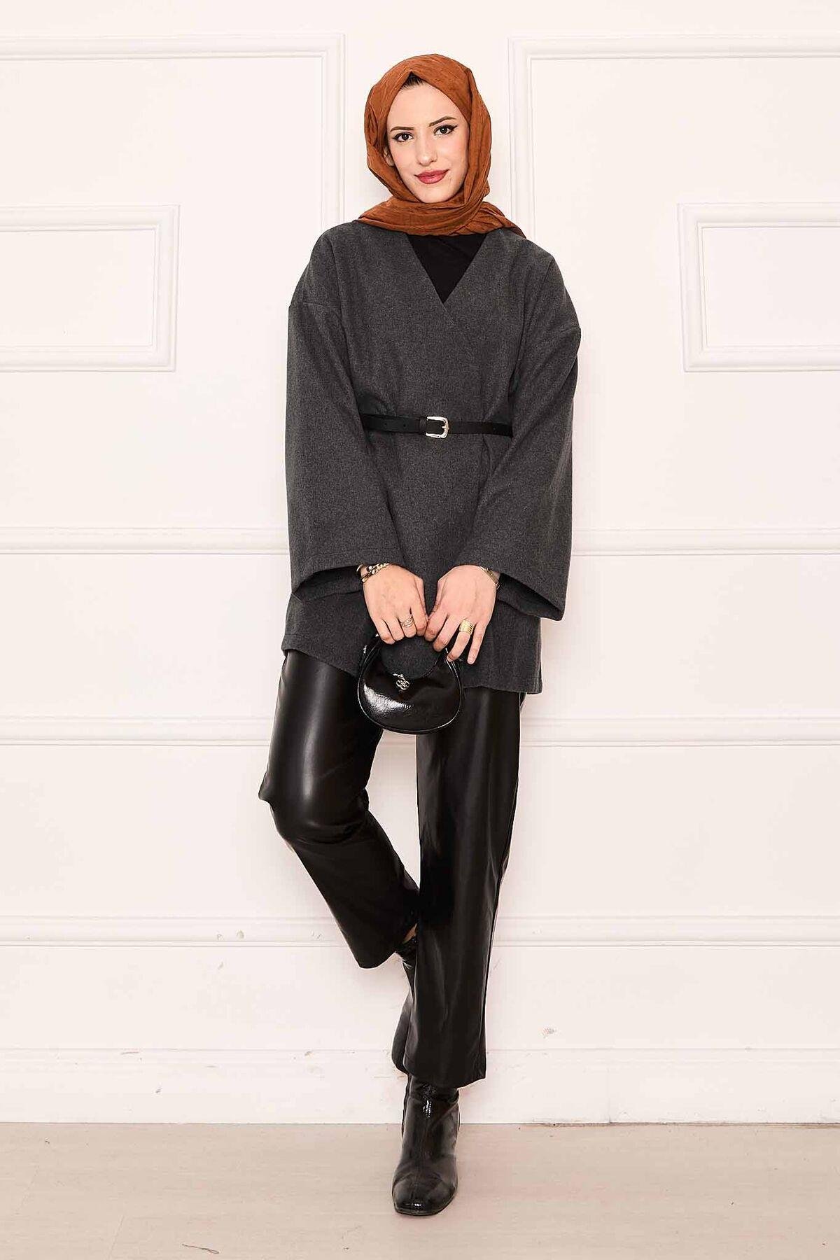 • Ürün Sonbahar & Kış modasıdır. Kendinden deri kemerli önü açık kolları salaş kaşe kap