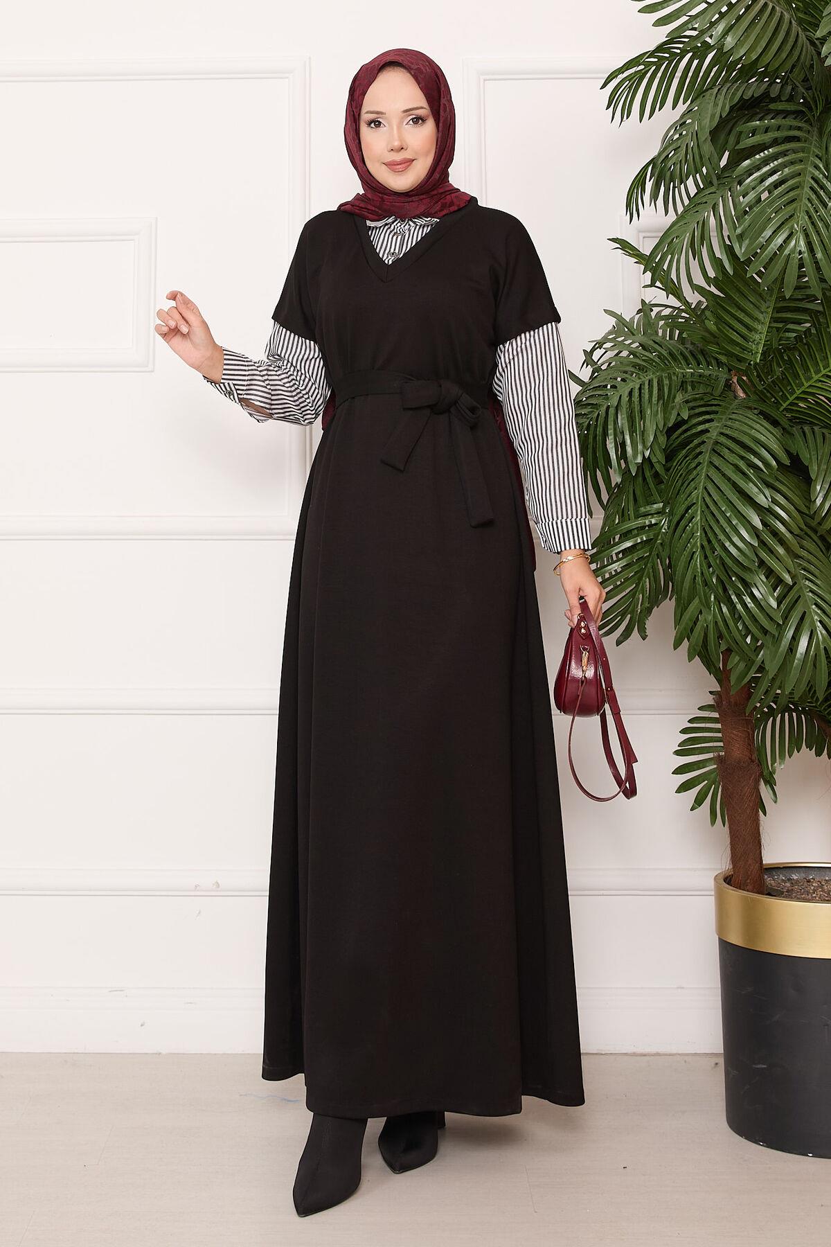 • Ürün mevsimliktir. Kolu ve yakası çizgili seyyar kuşaklı tessettür elbise.Kol manşetlerinde düğme detayı vardır.