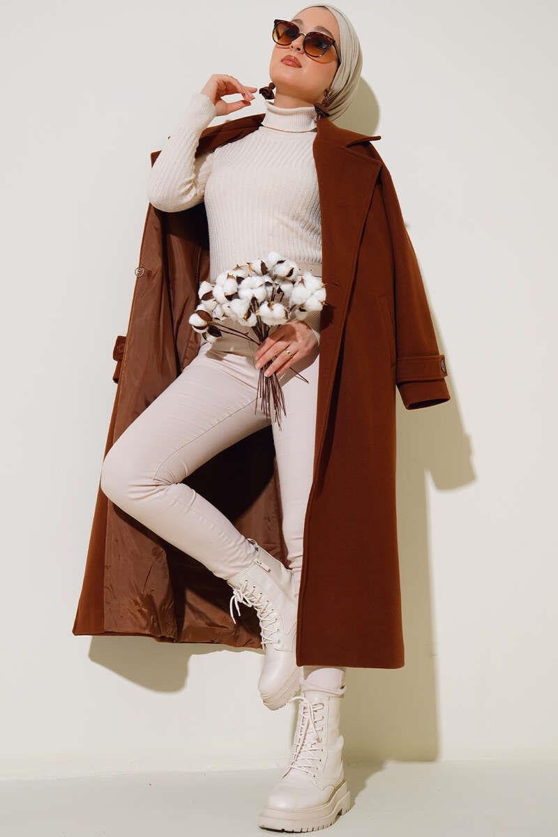 Çift Sıralı Uzun Kaşmir Palto Kahverengi