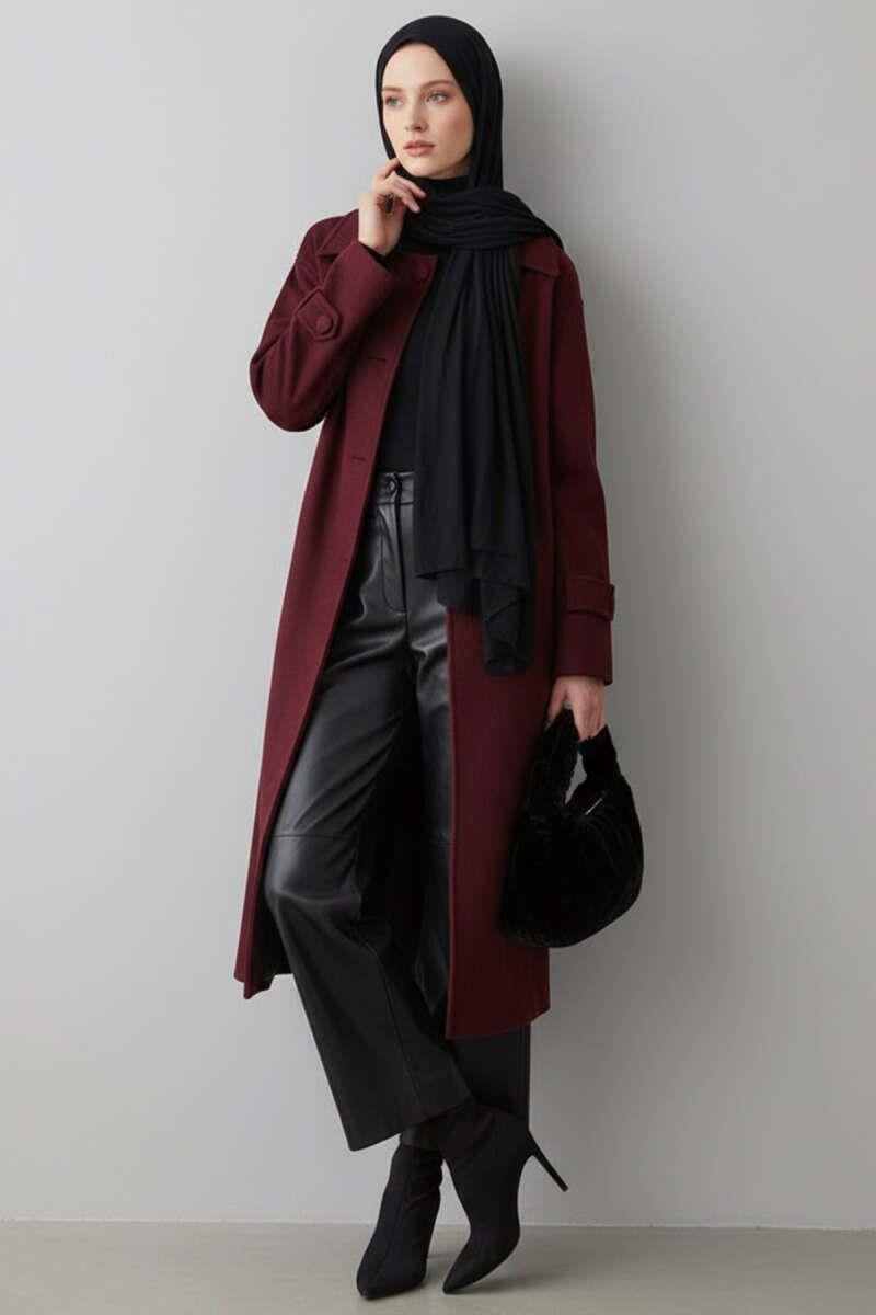 Kuşaklı Düğmeli Kaşe Kaban Bordo (0569-3218-673251)