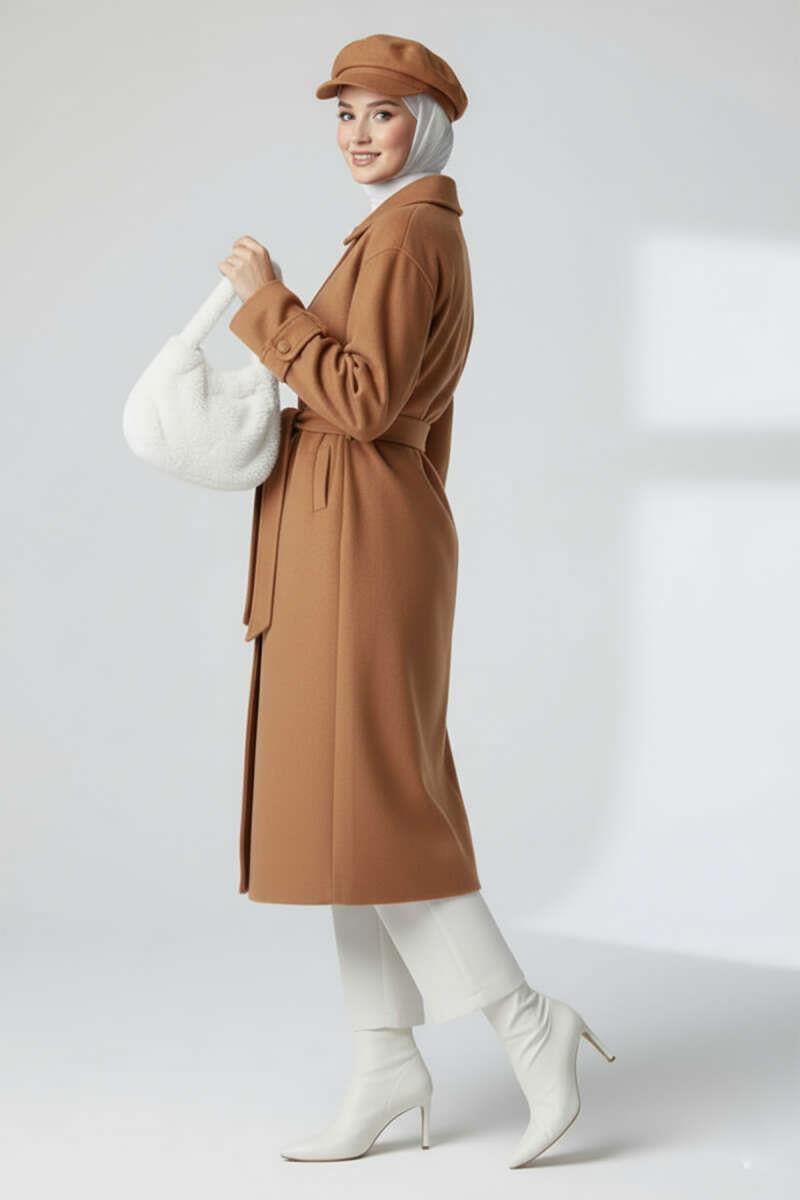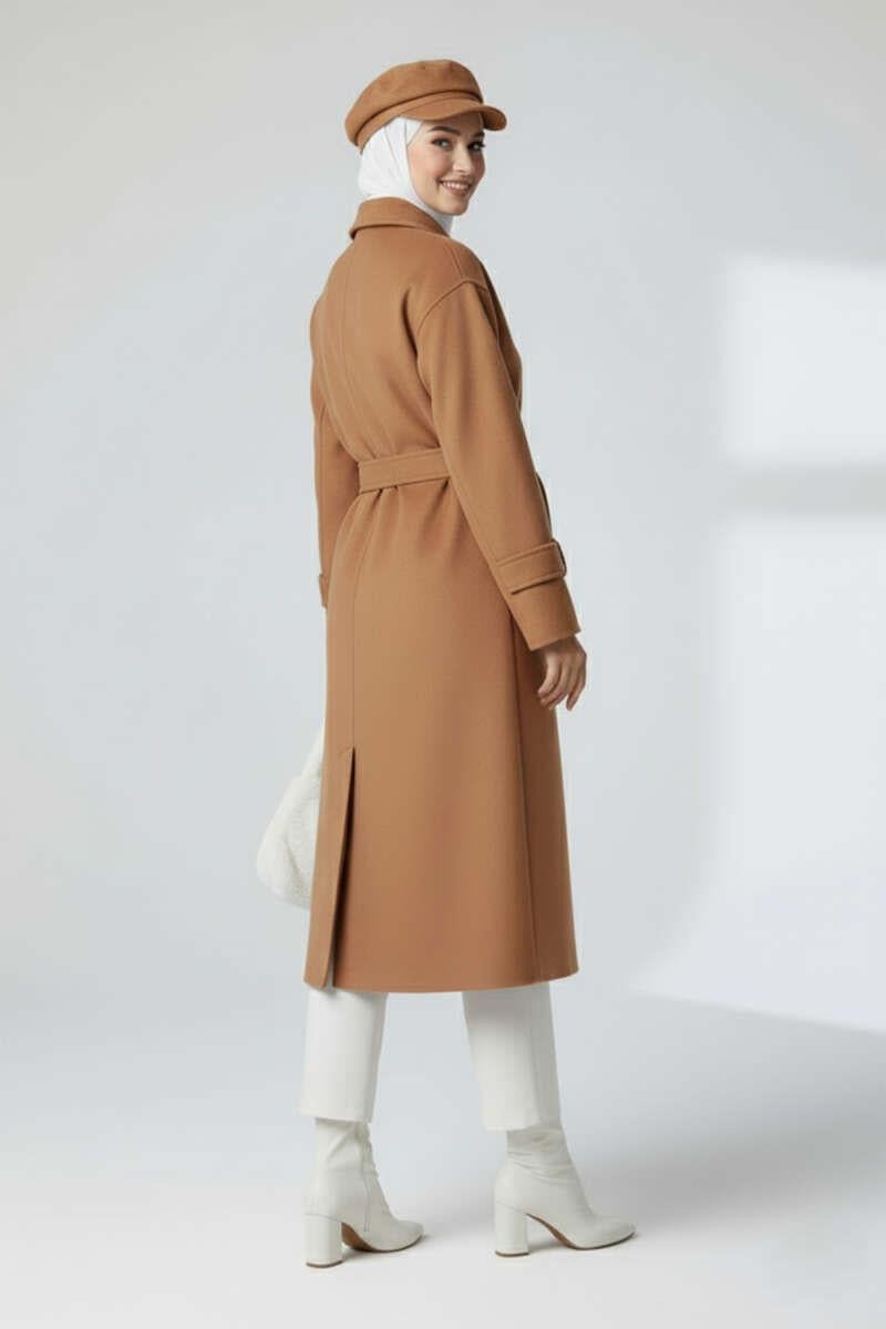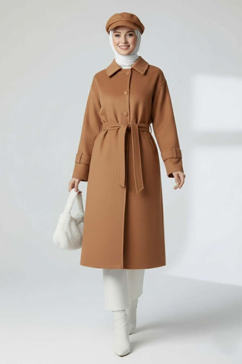 Kuşaklı Düğmeli Kaşe Kaban Taba (0569-3218-673271)