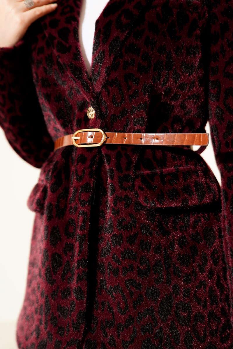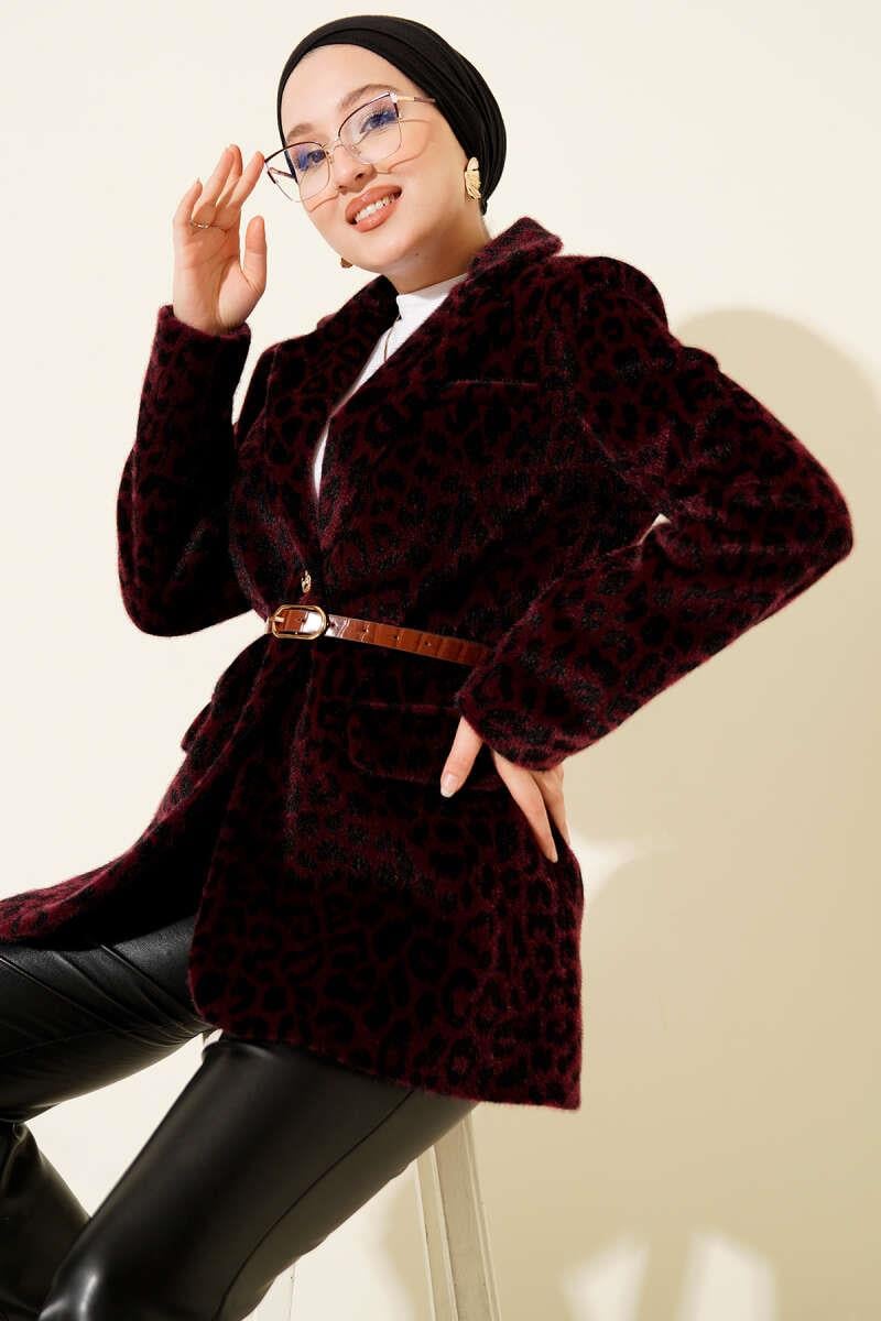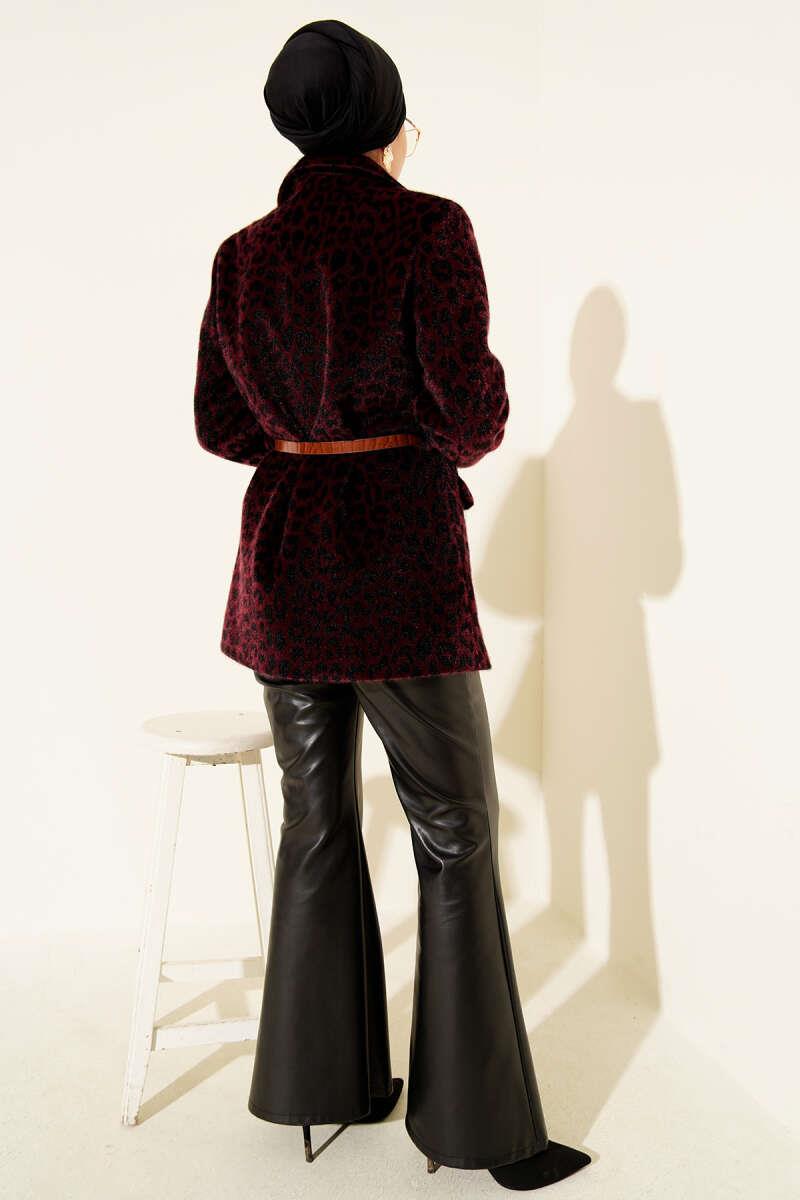 Leopar Desen Kemerli Tay Tüyü Ceket Mürdüm (0999-6467-25-682393)