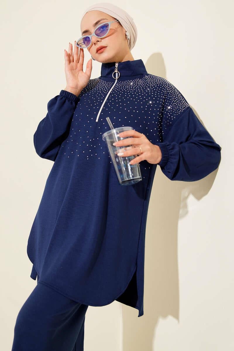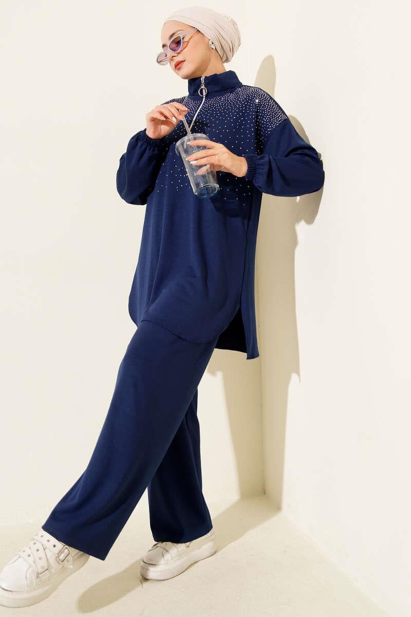 Loyşa Omuz Taşlı Fermuarlı İkili Takım İndigo (0829-5317-686181)