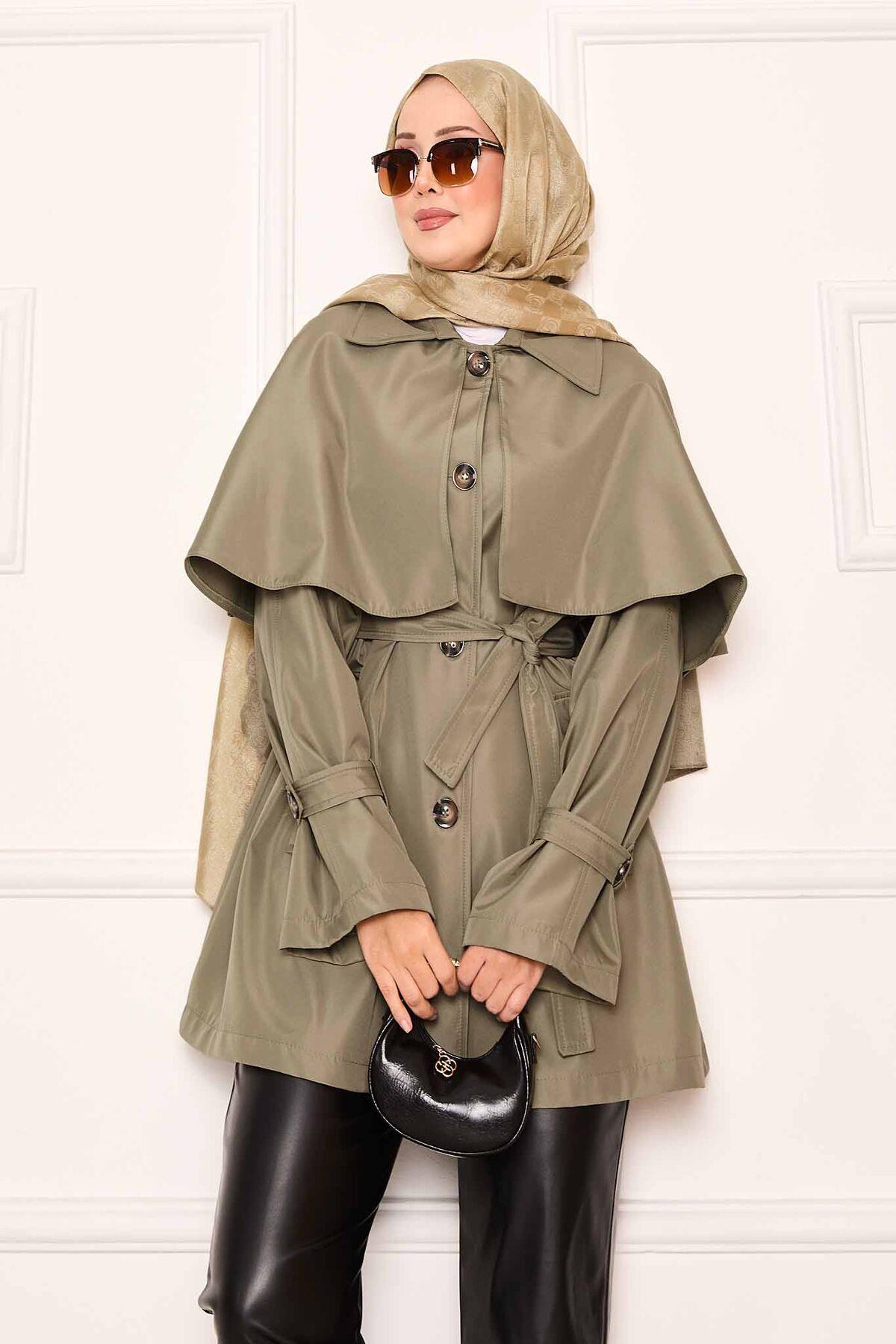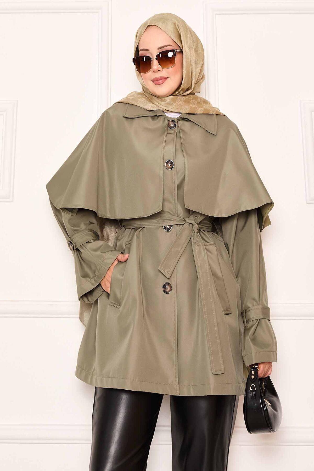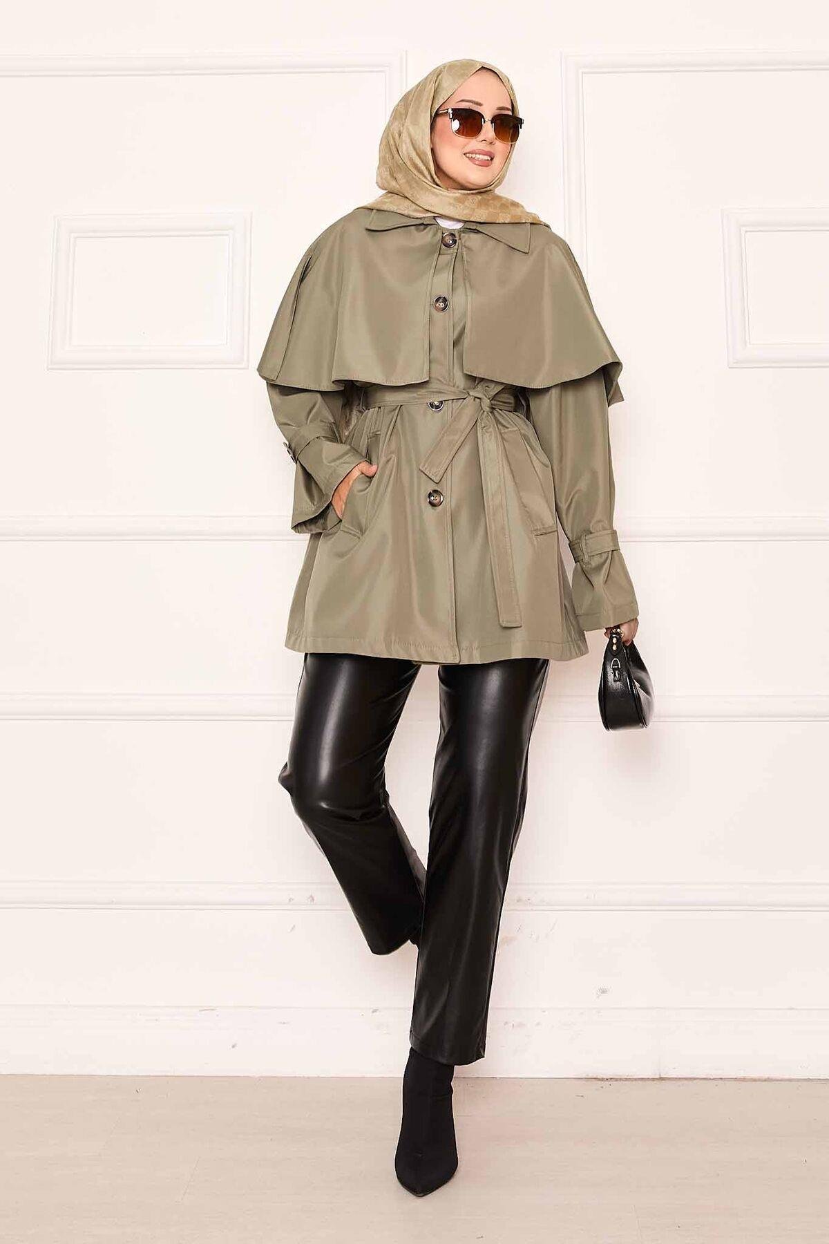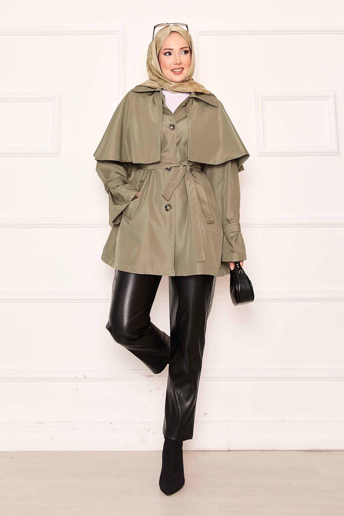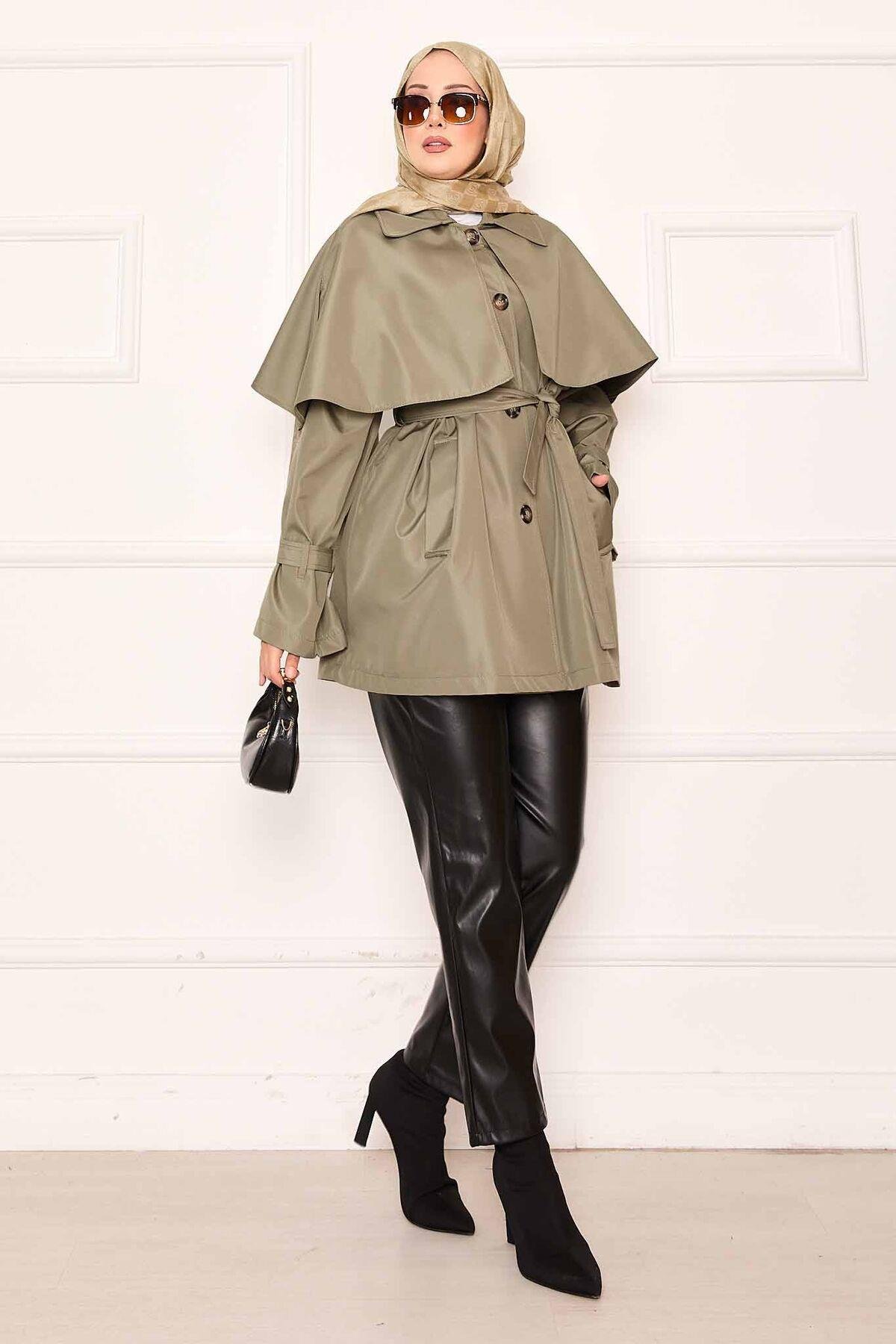 • Ürün Sonbahar & Kış modasıdır. Önden düğmeli yandan ceplidir. Belden seyyar kuşaklıdır. Pelerin detaylıdır. Kol manşetleri düğme detaylıdır