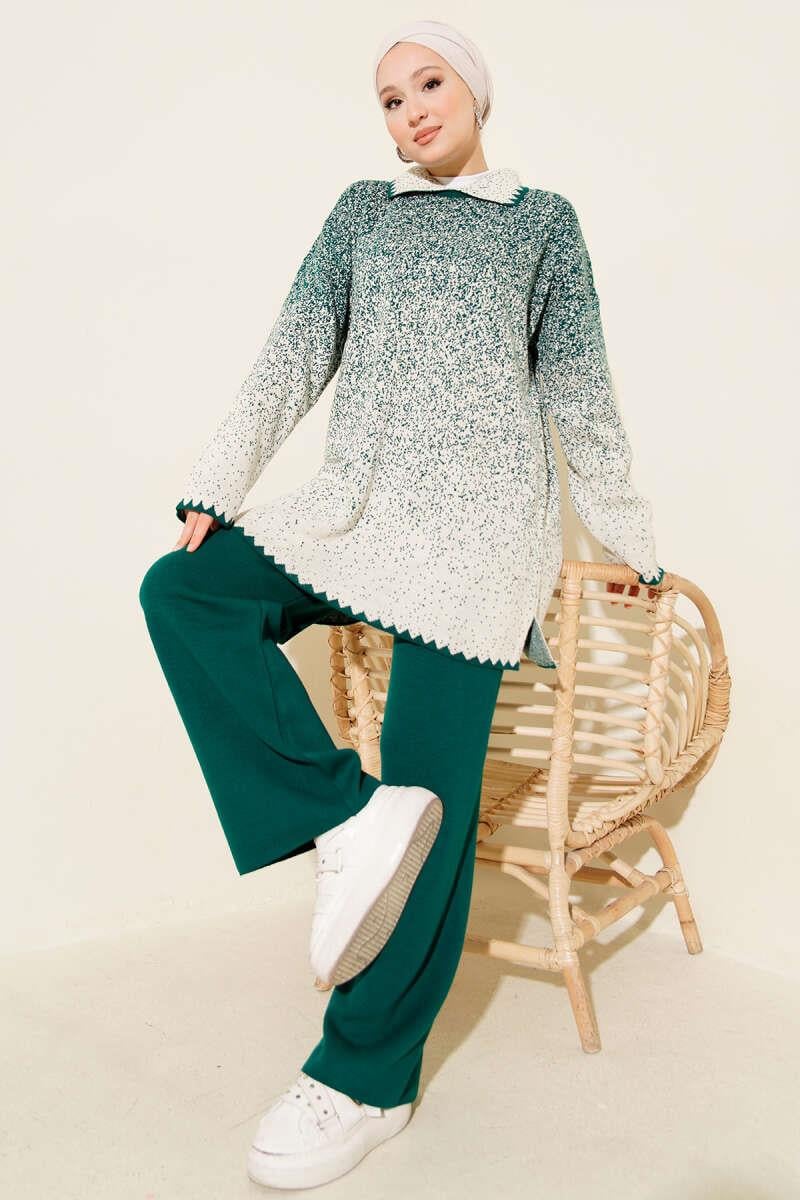 Nokta Desen Gömlek Yaka Triko Takım Zümrüt (8700-1123-687868)