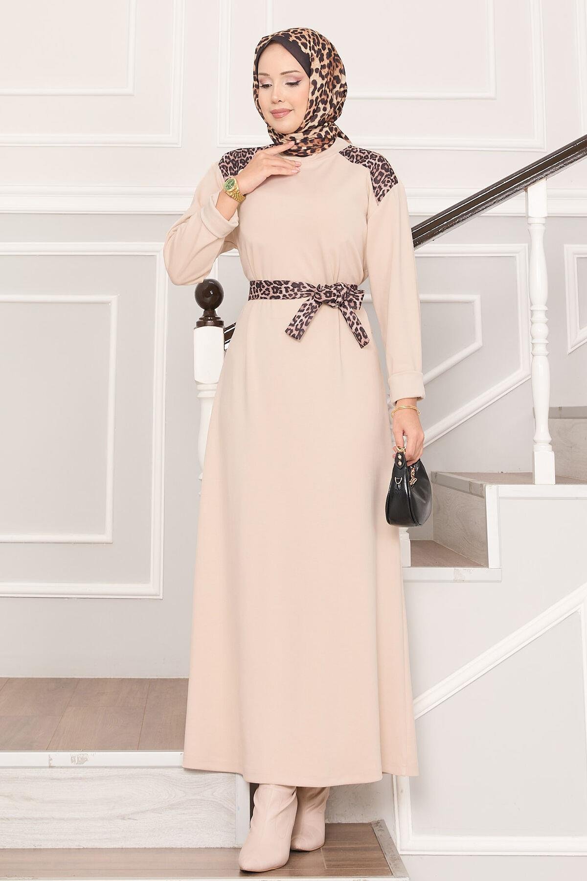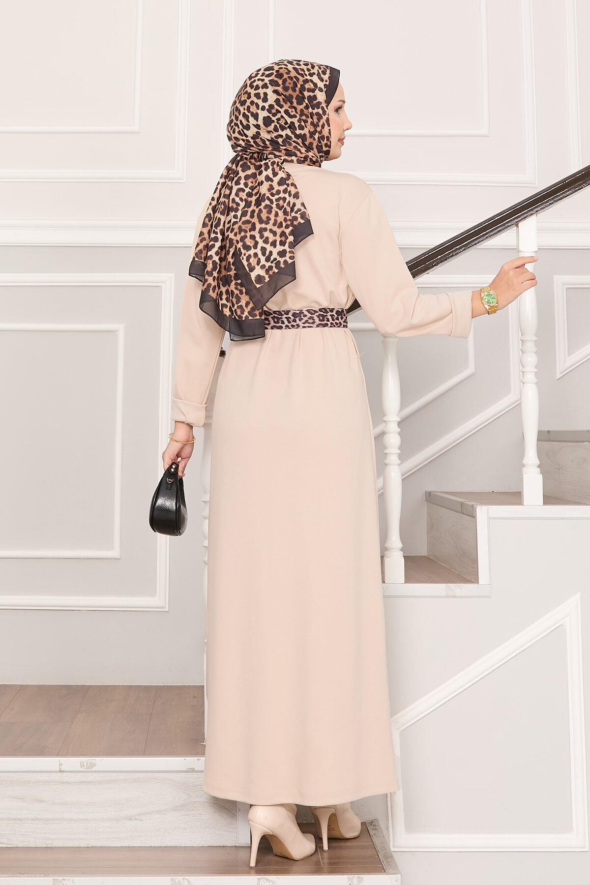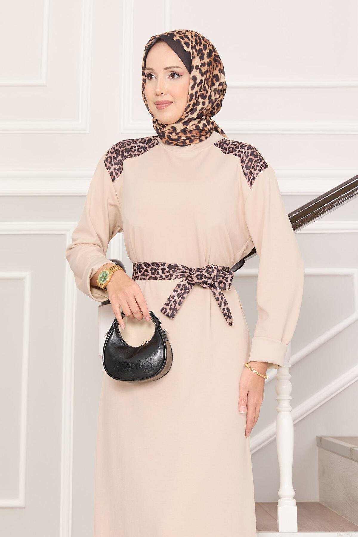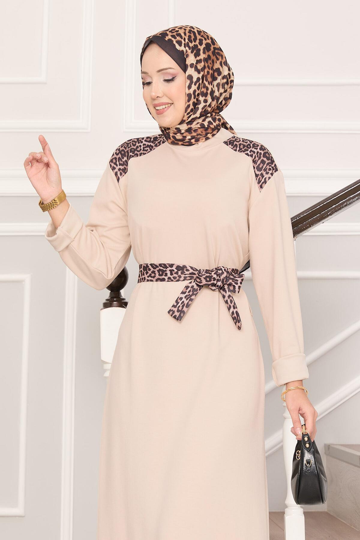 Omuz Leopar Garnili Kuşaklı Oyşo Elbise Bej (125M00811808R0638)
