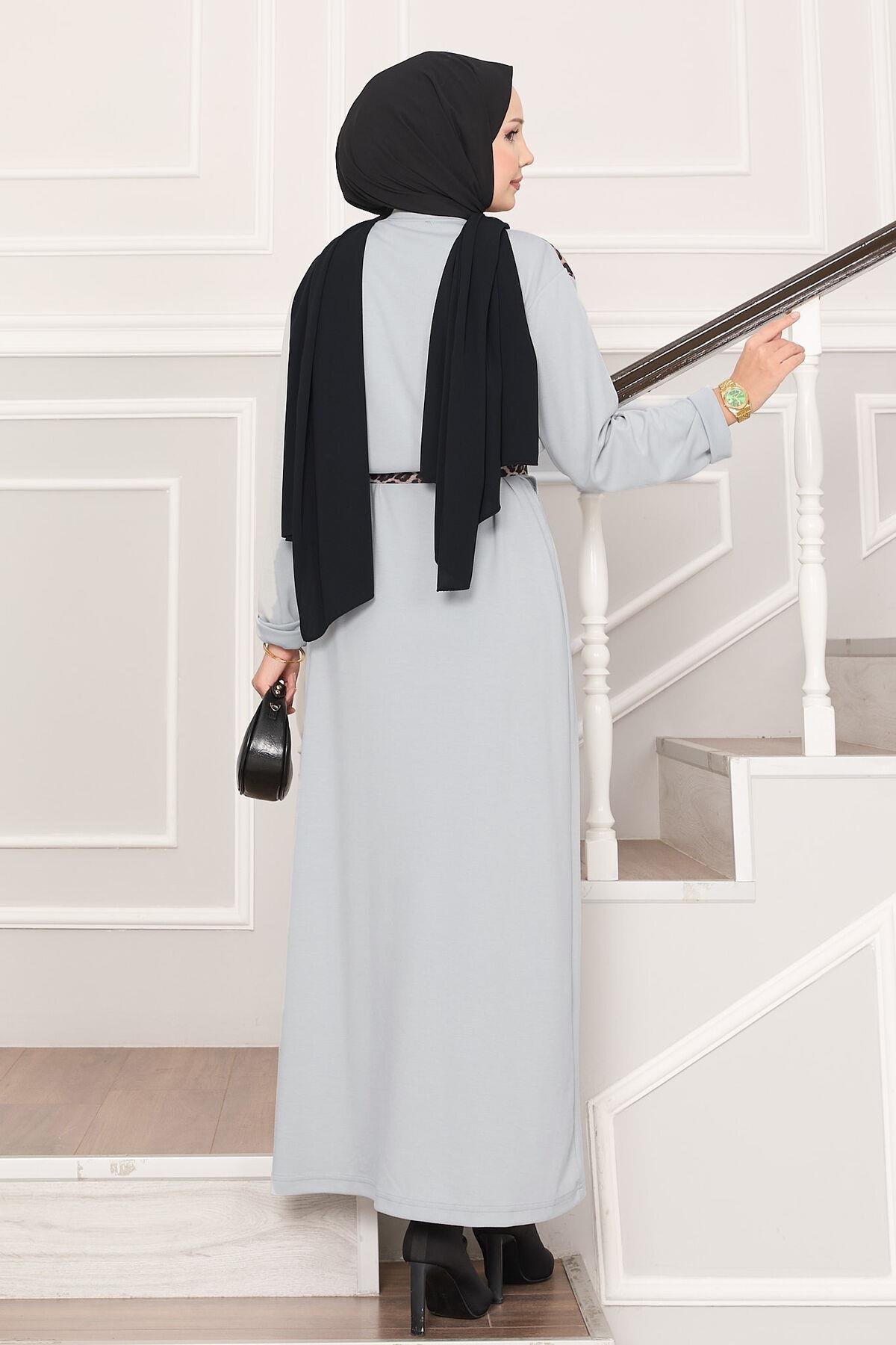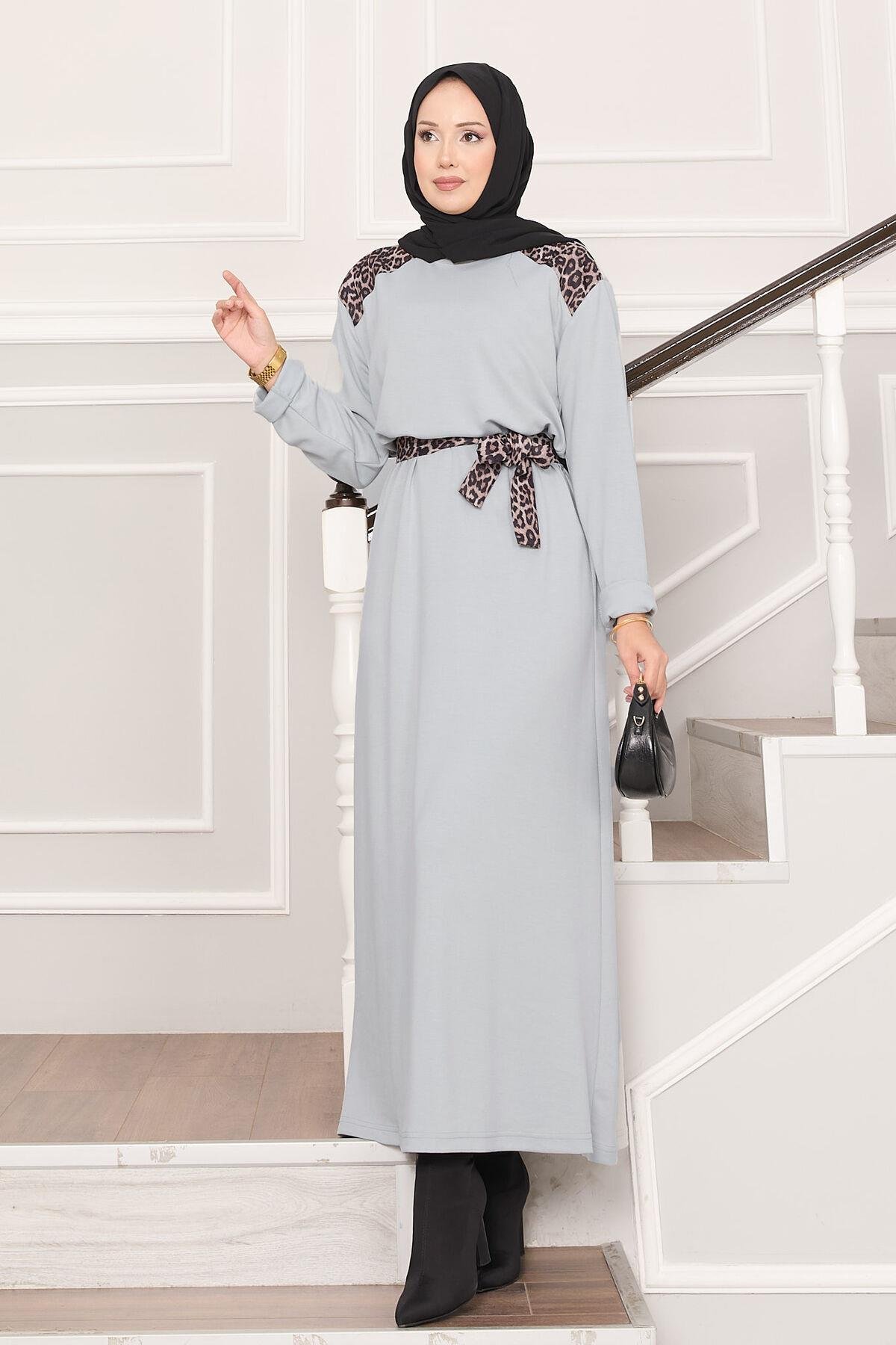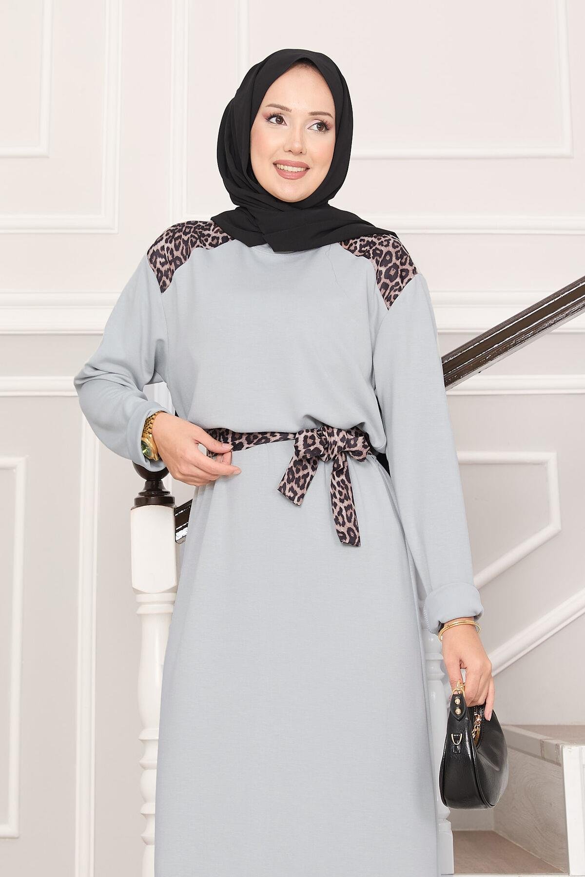 Omuz Leopar Garnili Kuşaklı Oyşo Elbise Gri (125M00811808R1938)