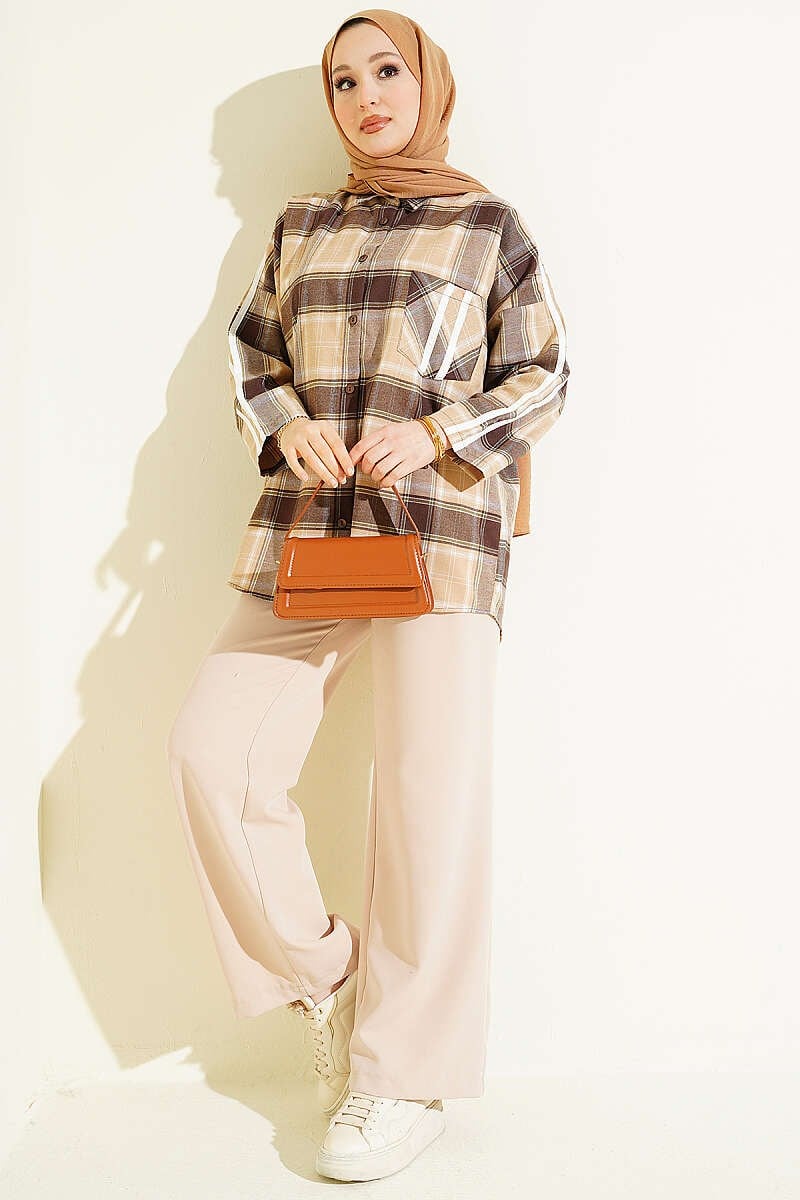 Omuz Şeritli Ekoseli Gömlek Bej (0853-3075-751363)