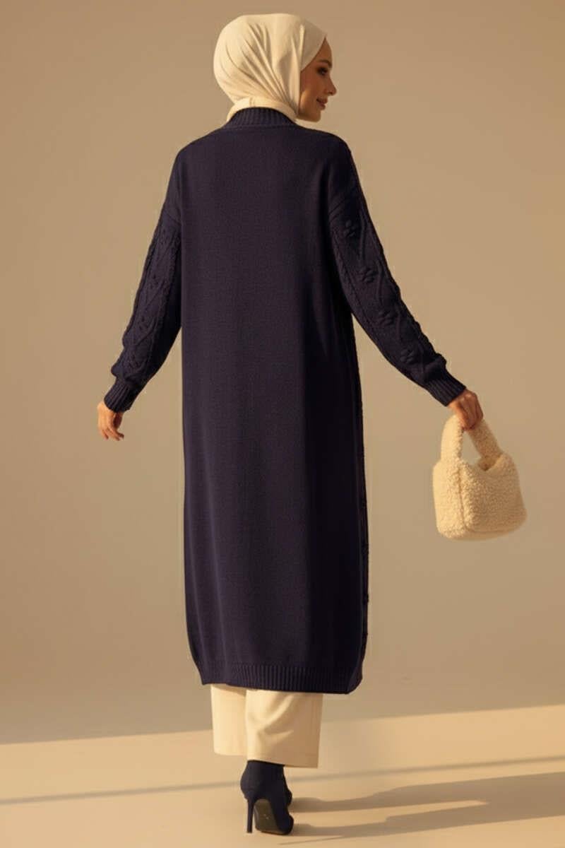 Örgü Kabartma Desenli Uzun Triko Hırka Lacivert (0875-4222-670432)