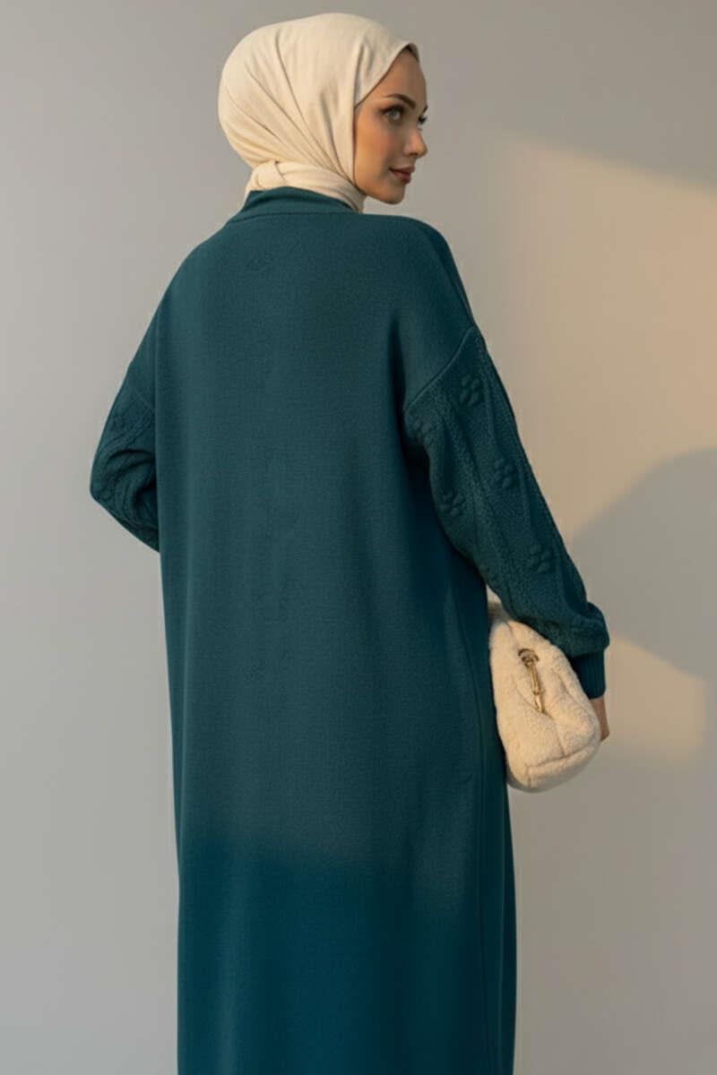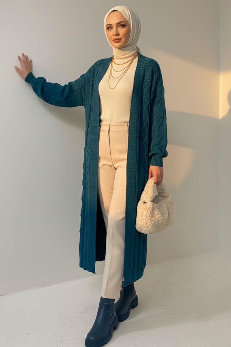 Örgü Kabartma Desenli Uzun Triko Hırka Petrol (0875-4222-670433)