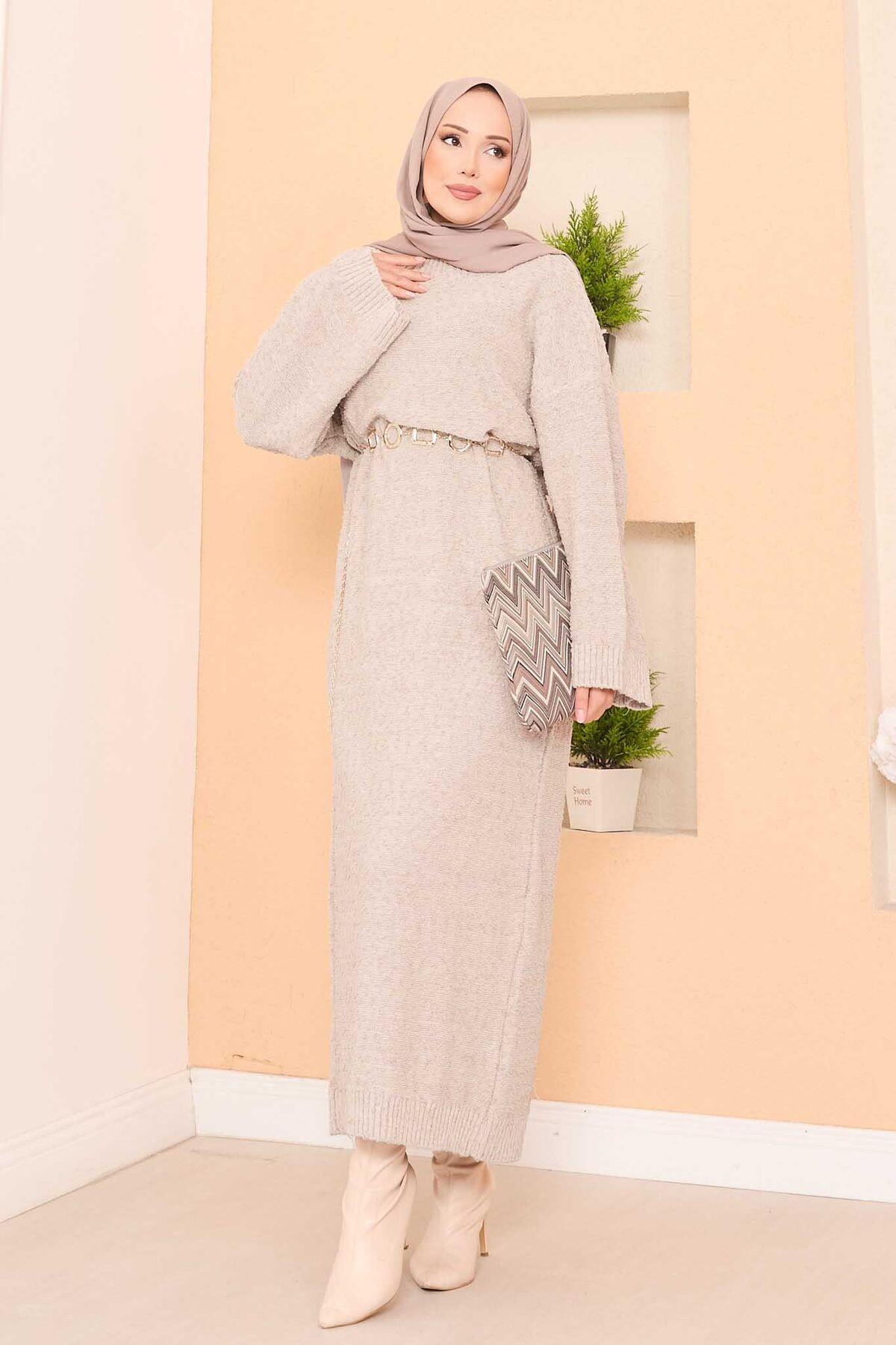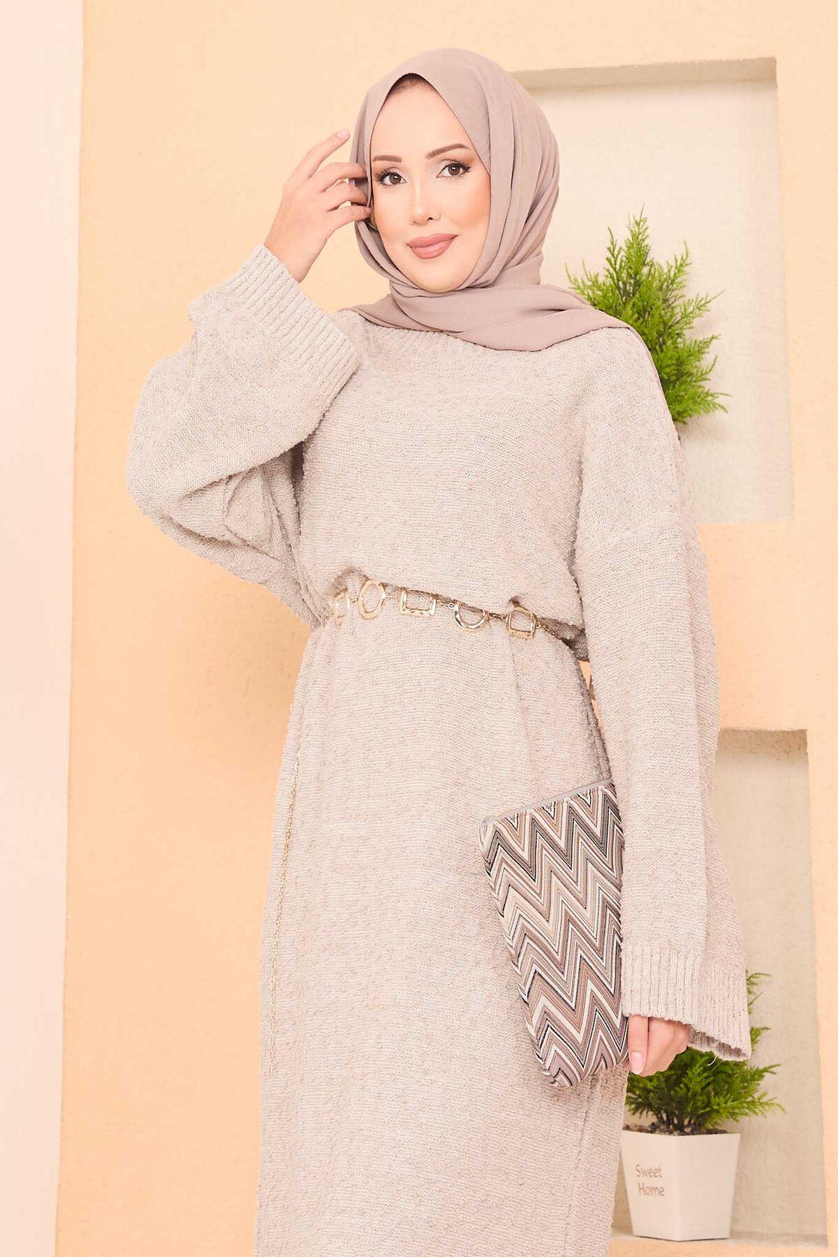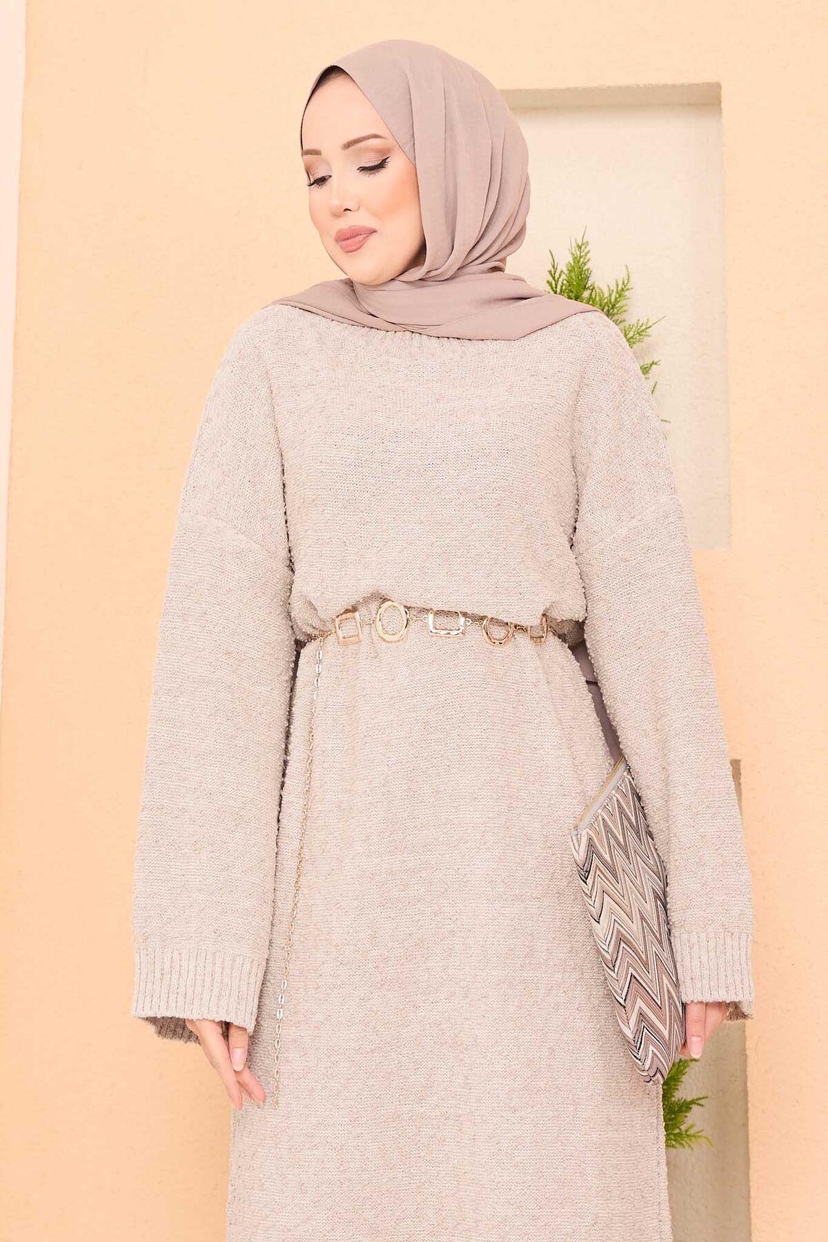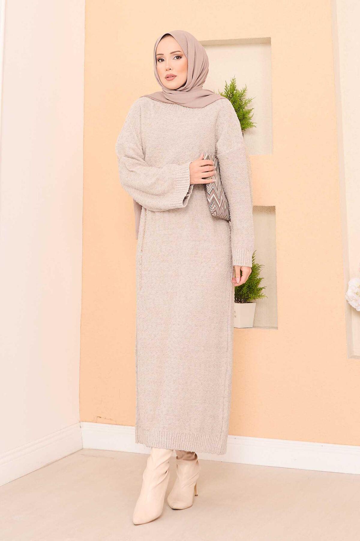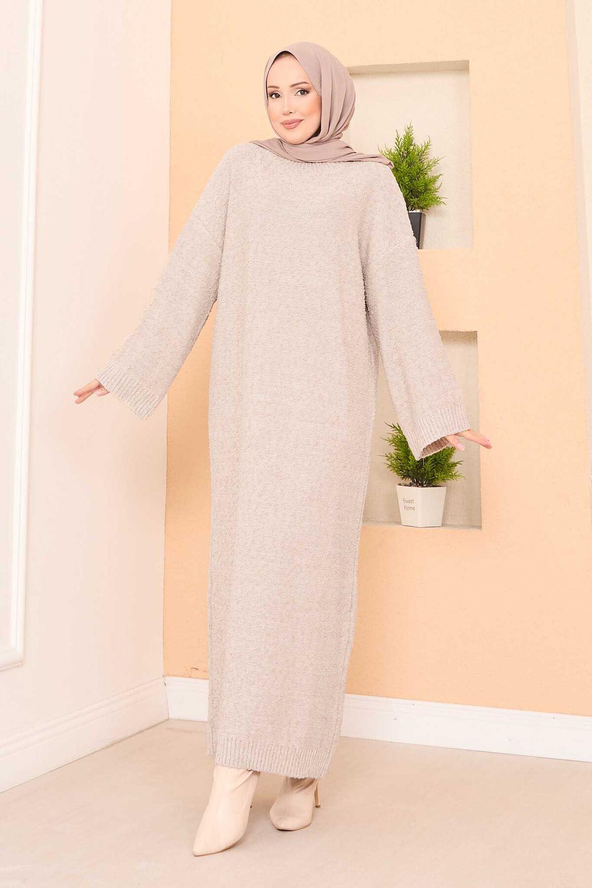 Pıtırcık Dokulu Oversize Tesettür Elbise Bej (125M00814472R06STD)