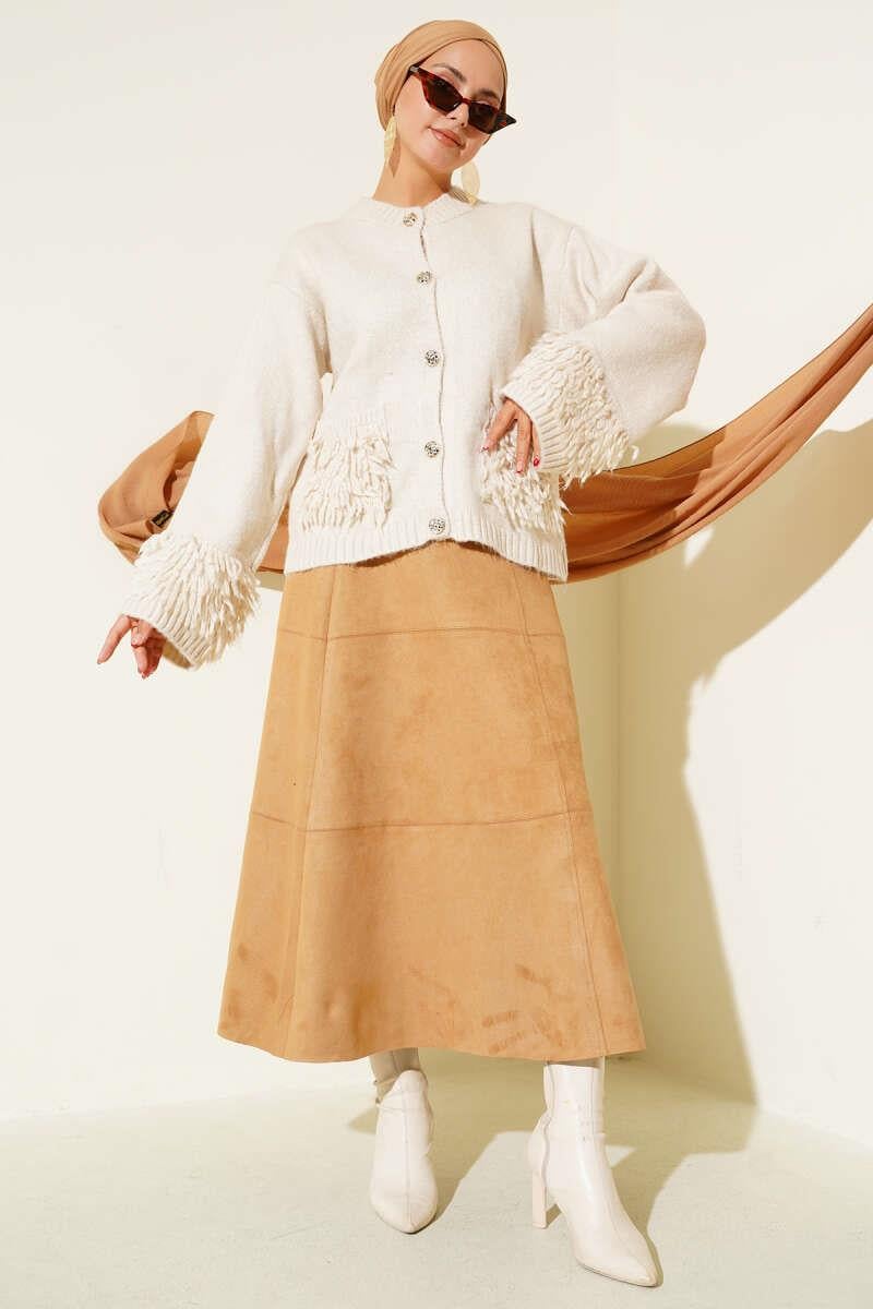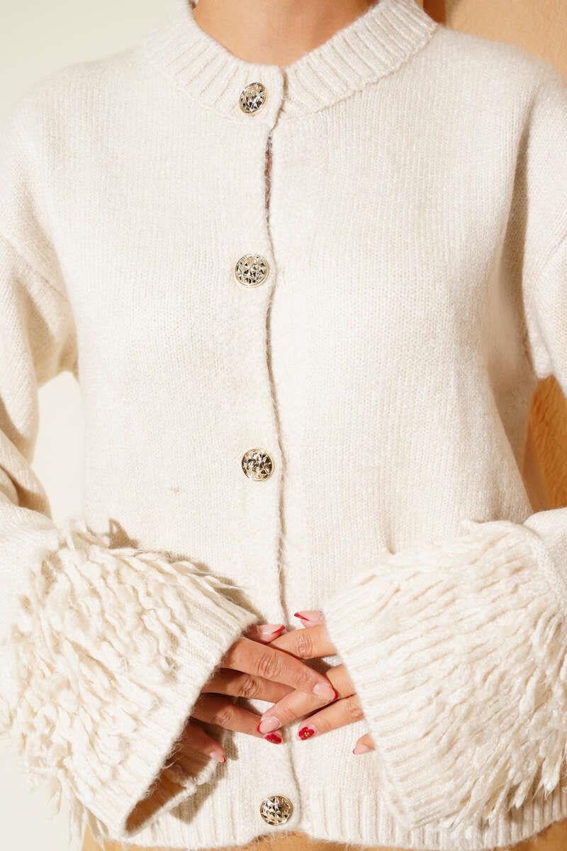Püsküllü Düğme Detaylı Triko Hırka Bej (0853-1107-673056)