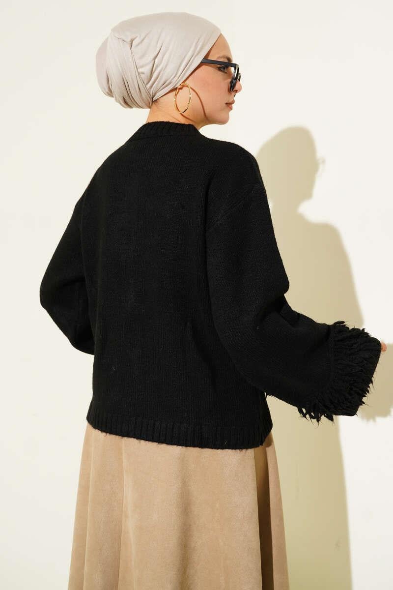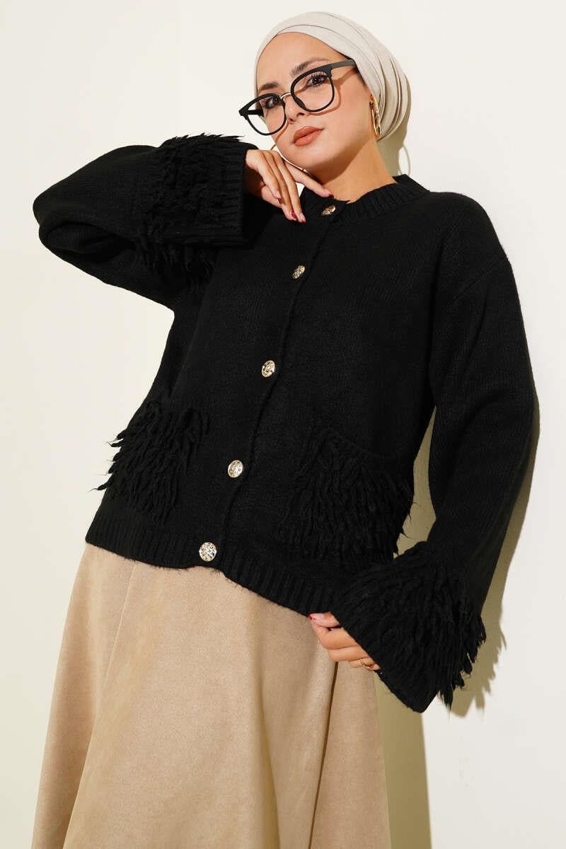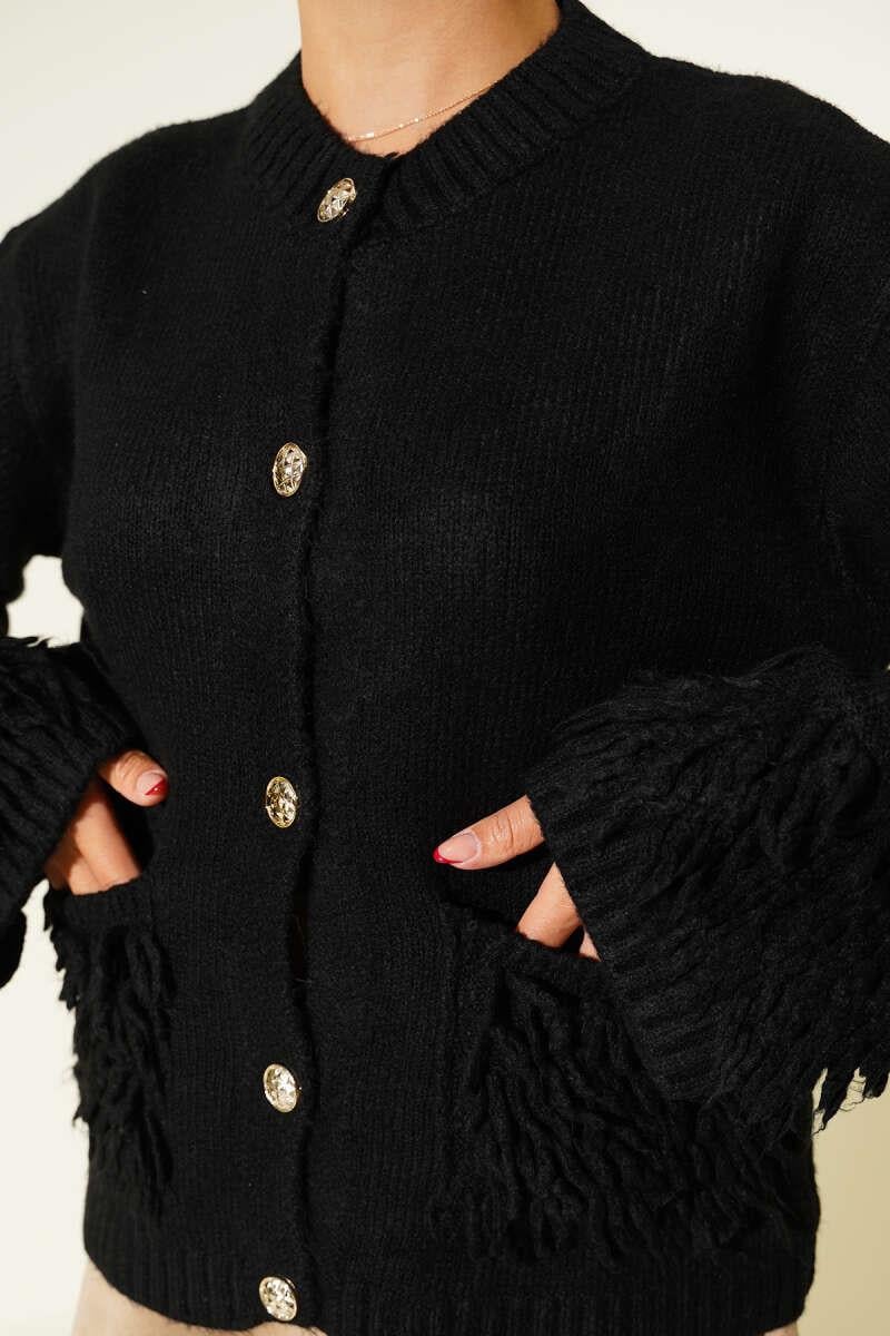 Püsküllü Düğme Detaylı Triko Hırka Siyah (0853-1107-673061)