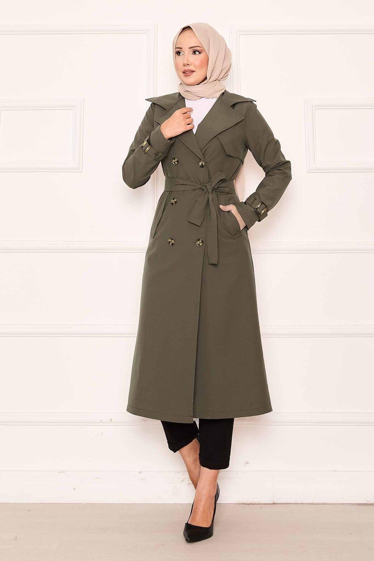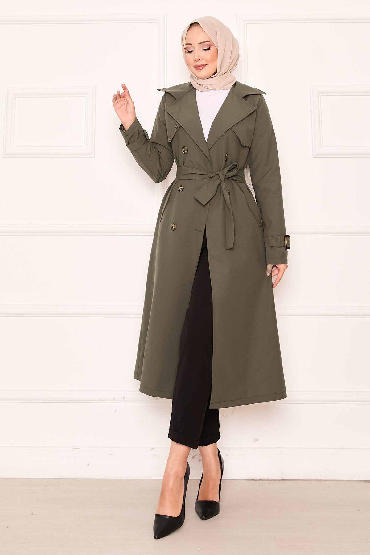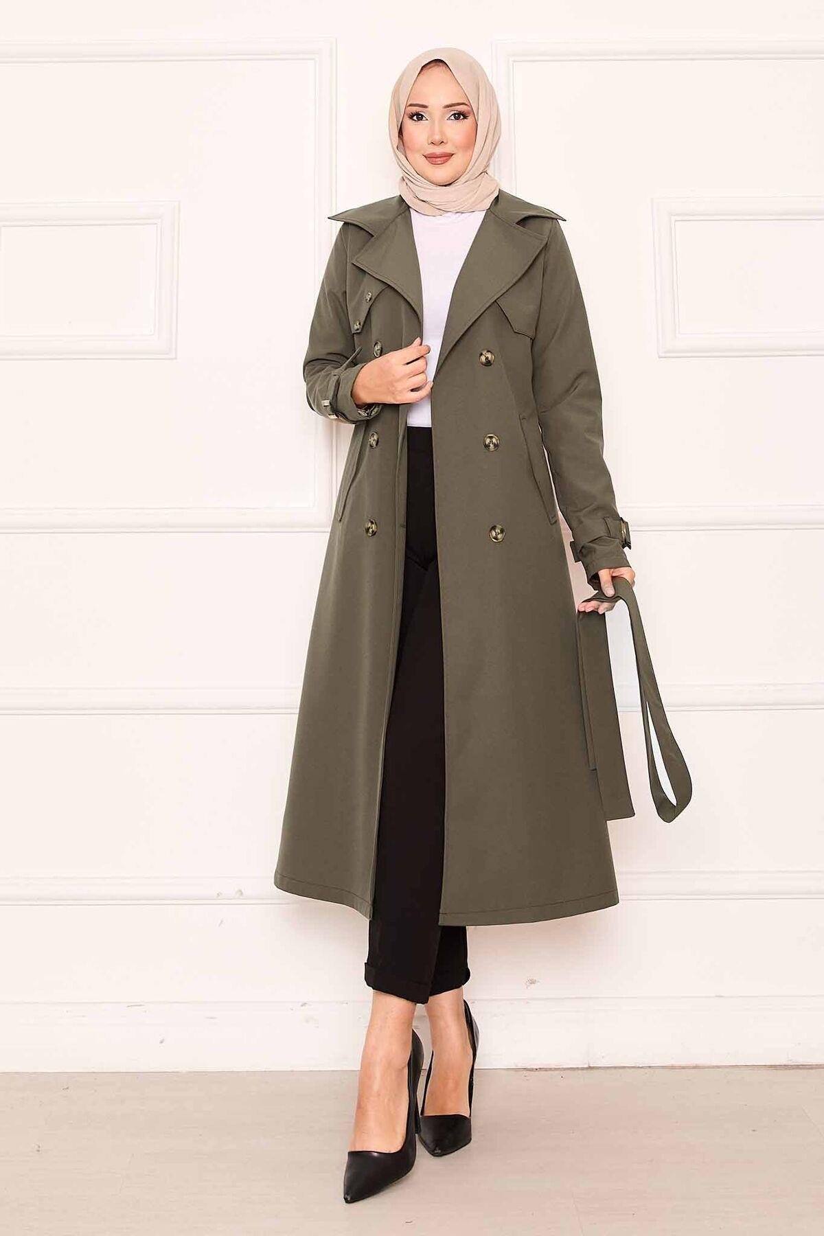 Rahat Kalıp Kruvaze Düğme Detaylı Kolları Ayarlanan Trençkot Haki (120M01925898R2240)