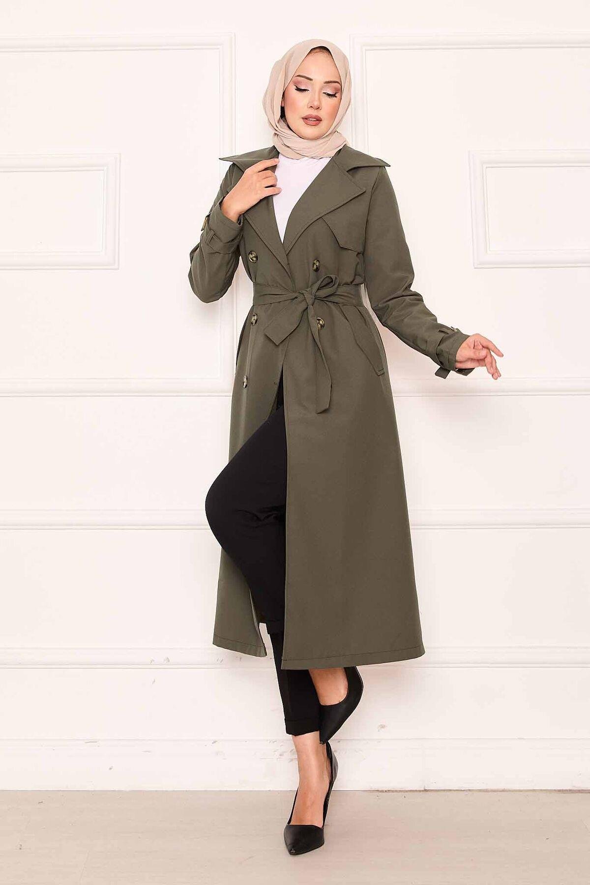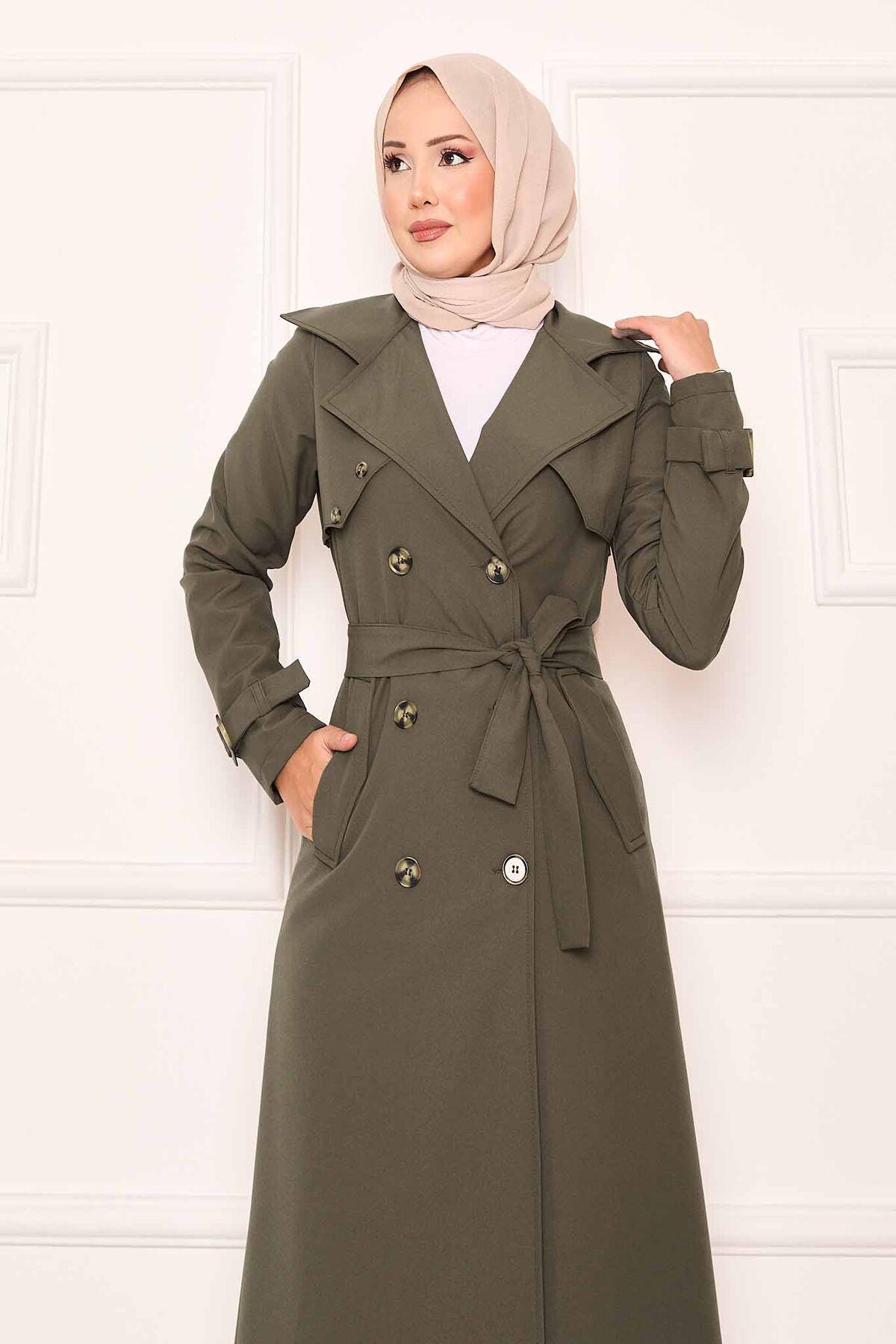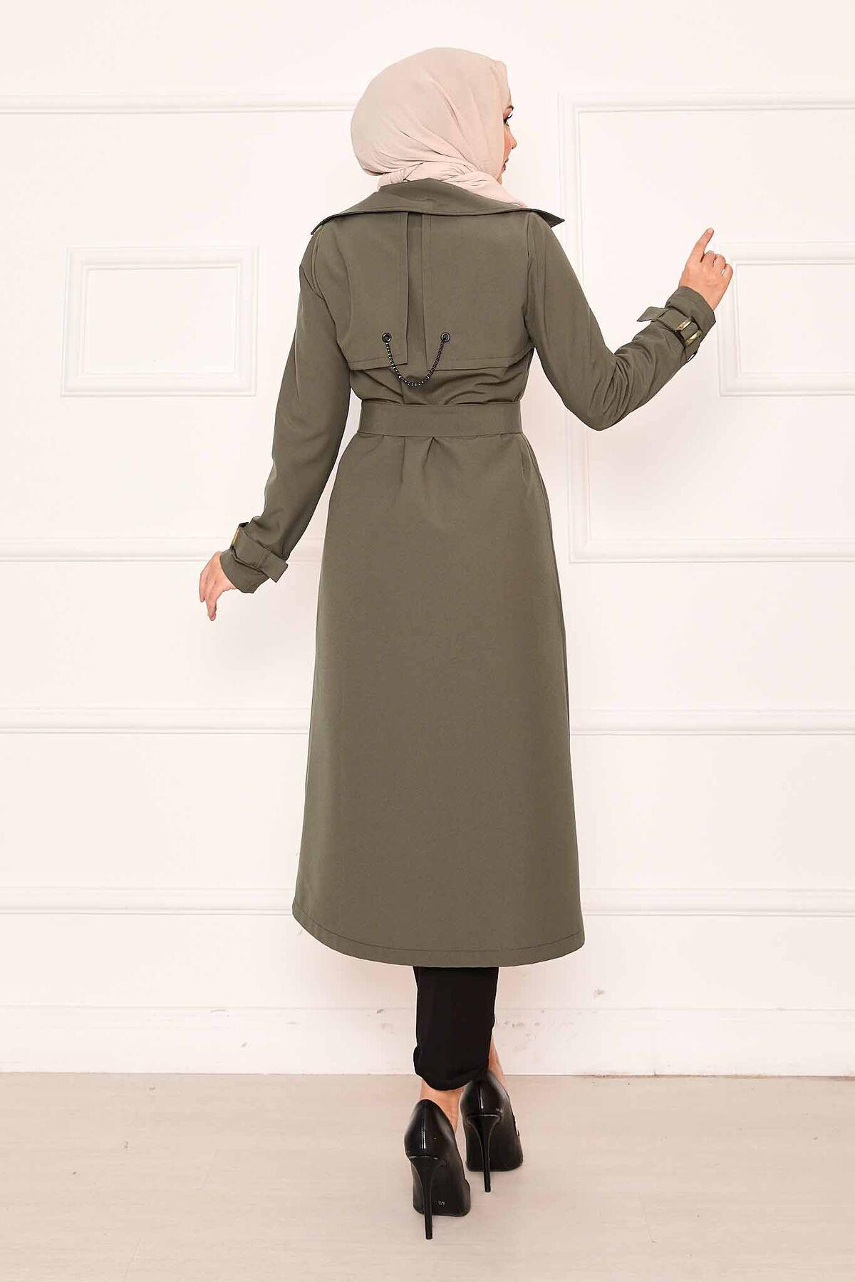 Rahat Kalıp Kruvaze Düğme Detaylı Kolları Ayarlanan Trençkot Haki (120M01925898R2240)