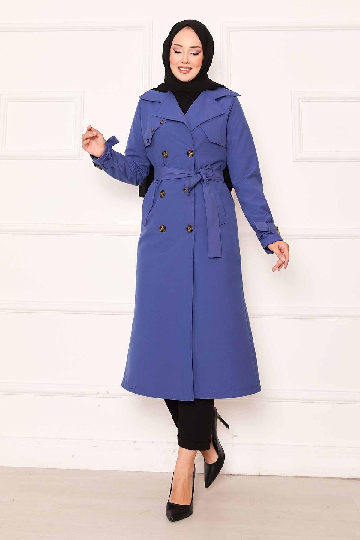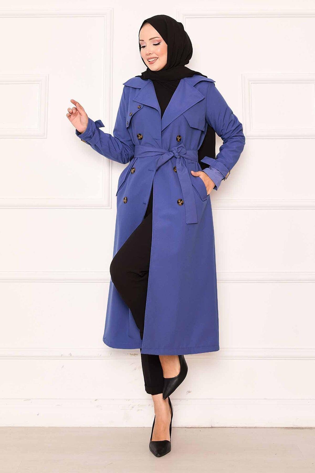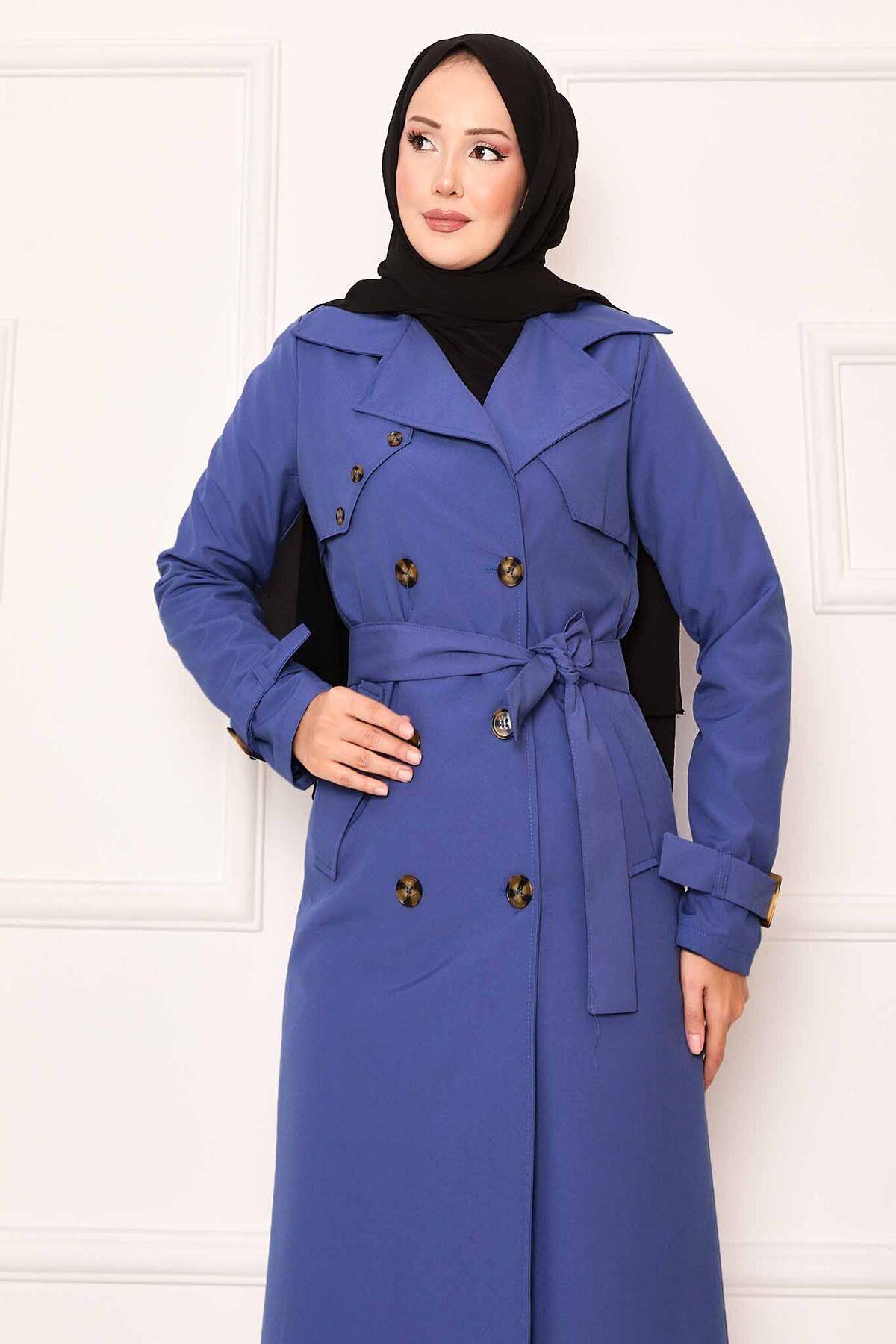 Rahat Kalıp Kruvaze Düğme Detaylı Kolları Ayarlanan Trençkot İndigo (120M01925898R2438)