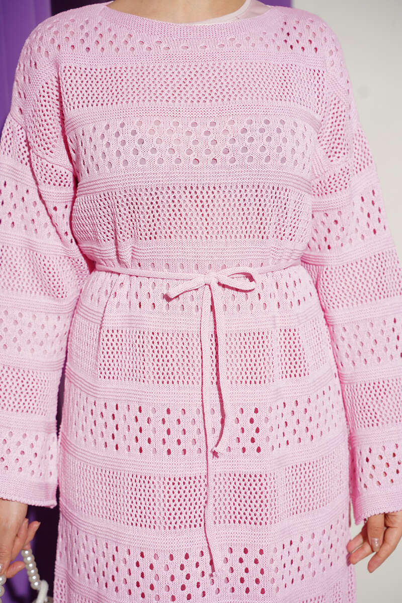 Şerit Ajur Desen Triko Elbise Pembe (0875-4497-723790)