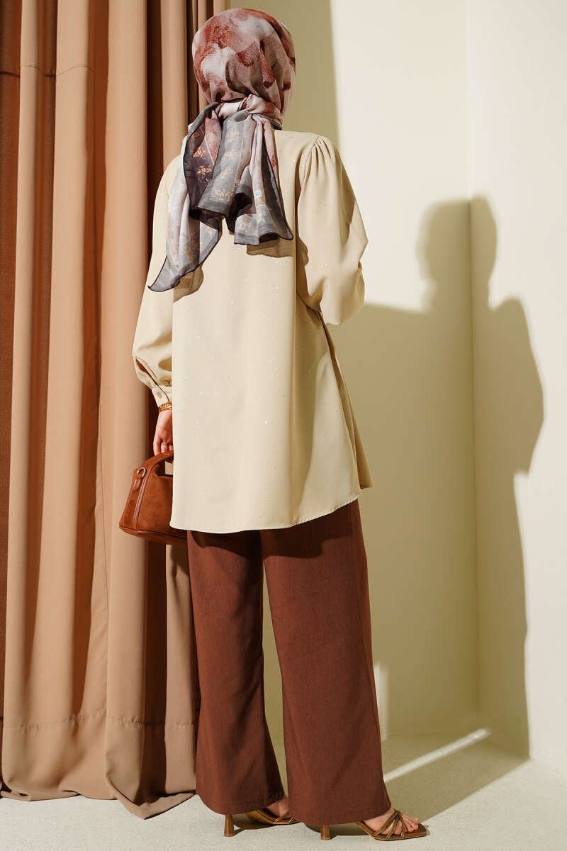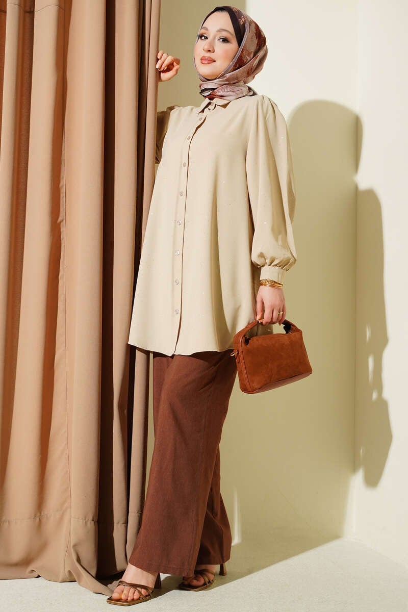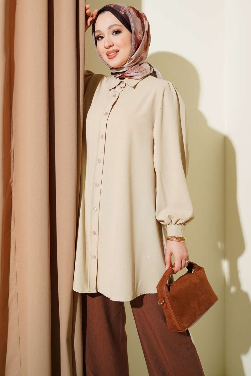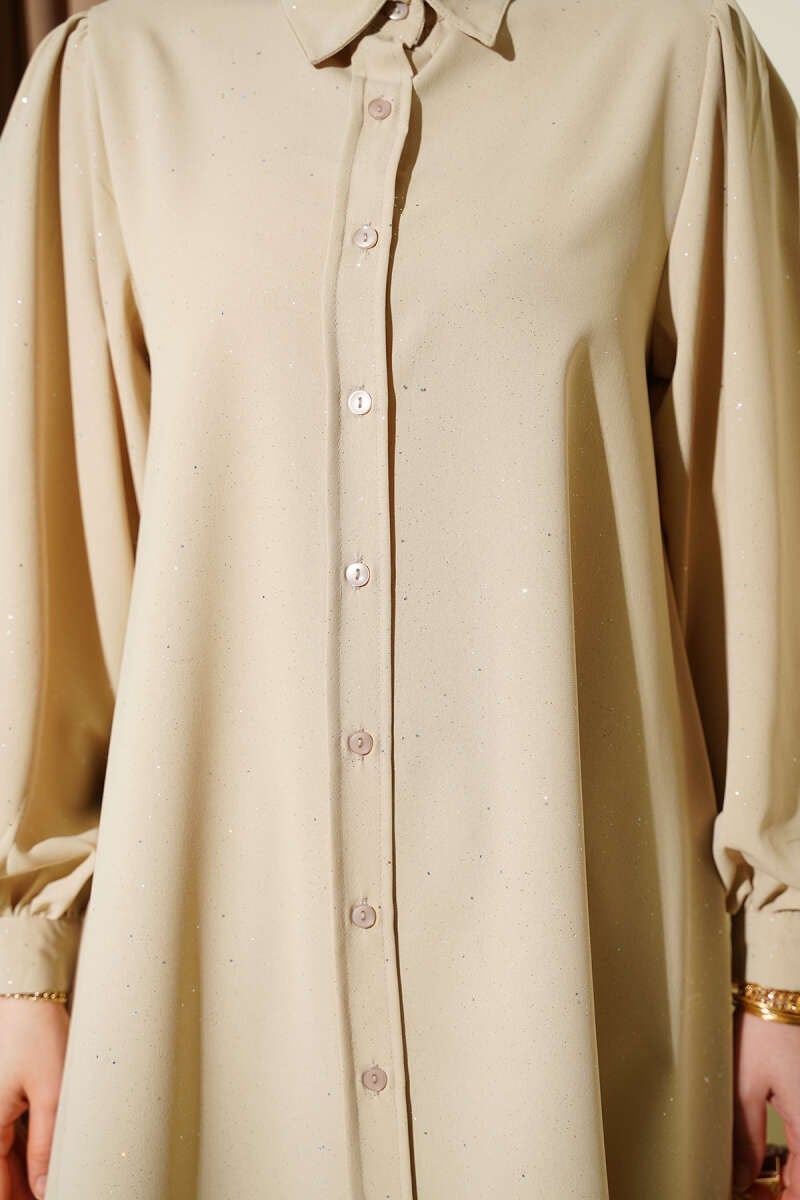 Simli Balon Kol Gömlek Bej (0428-8436-740464)