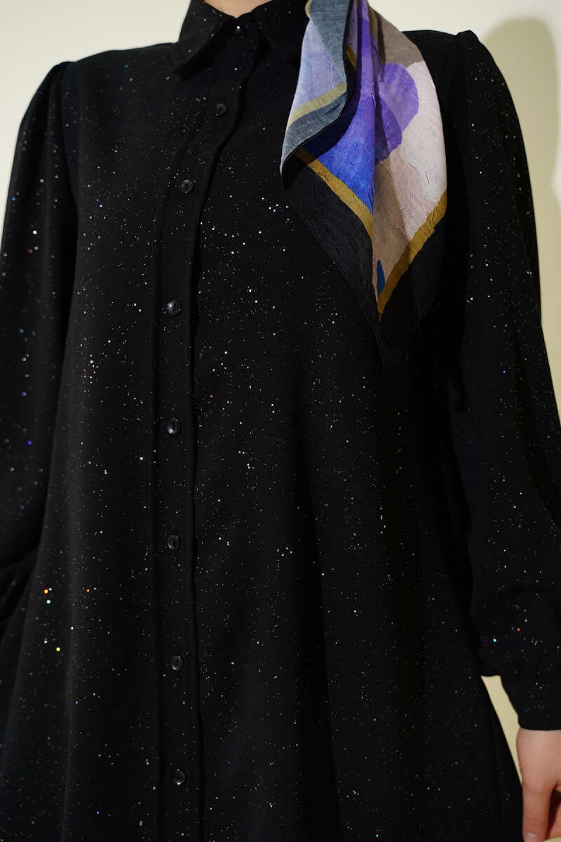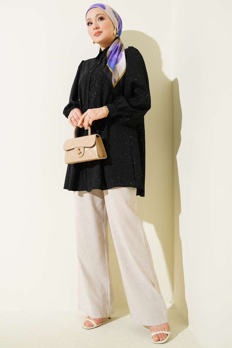 Simli Balon Kol Gömlek Siyah (0428-8436-740483)