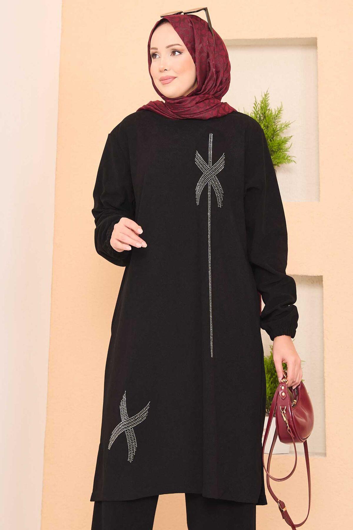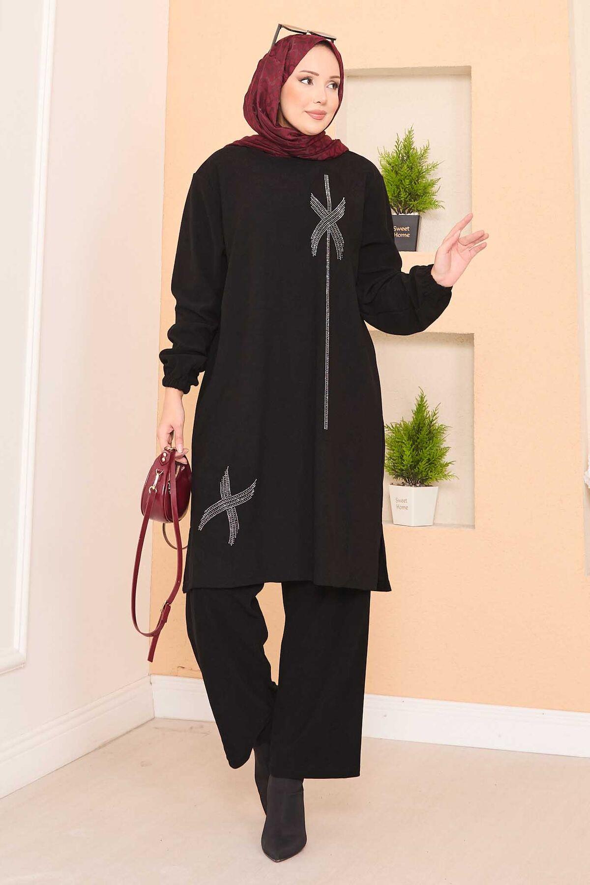 Stilize Taş Desenli Mini Yırtmaçlı Tesettür Takım Siyah (125M00610244R5242)