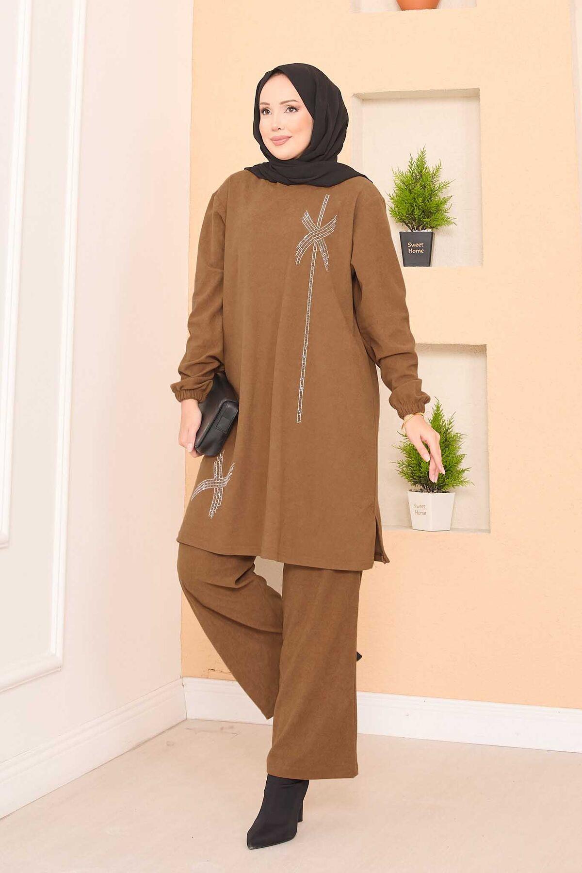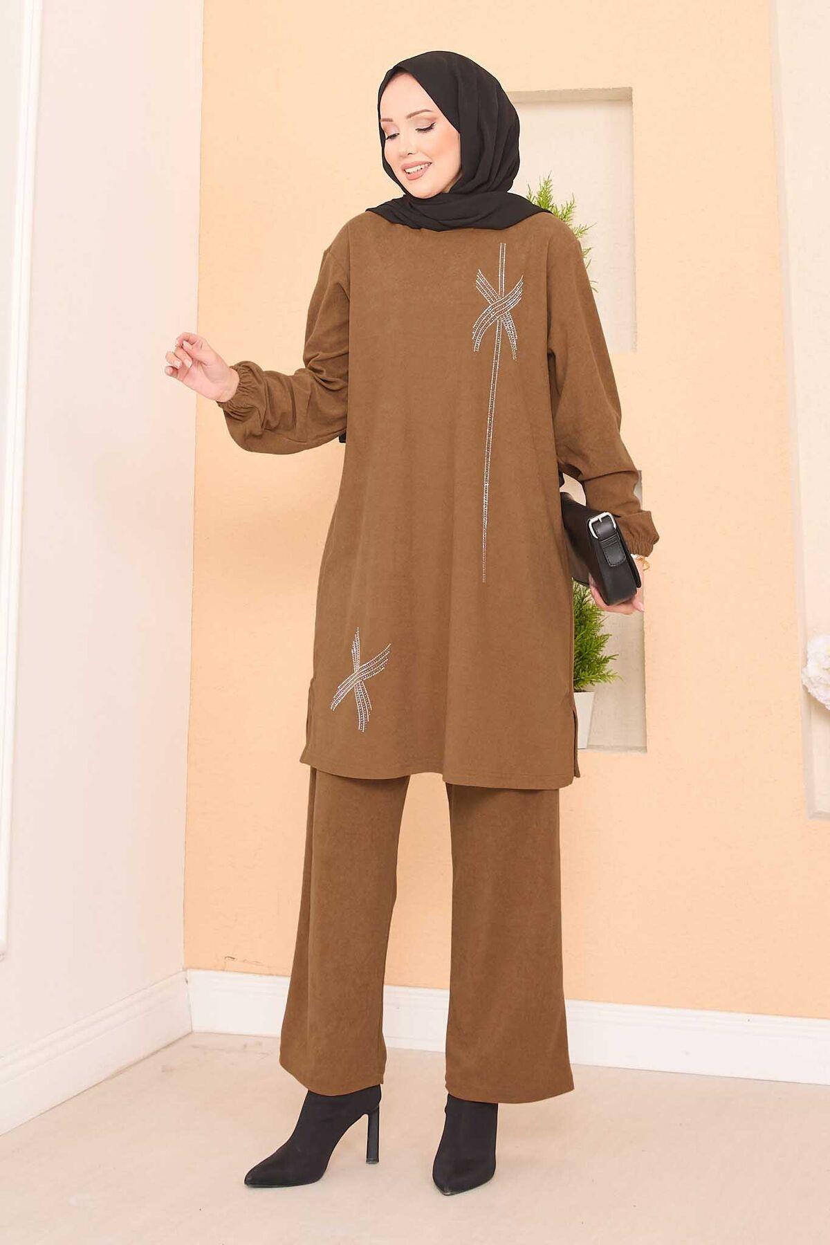Stilize Taş Desenli Mini Yırtmaçlı Tesettür Takım Taba (125M00610244R5842)