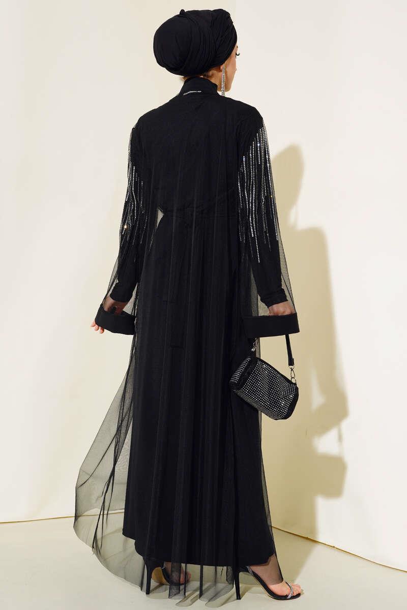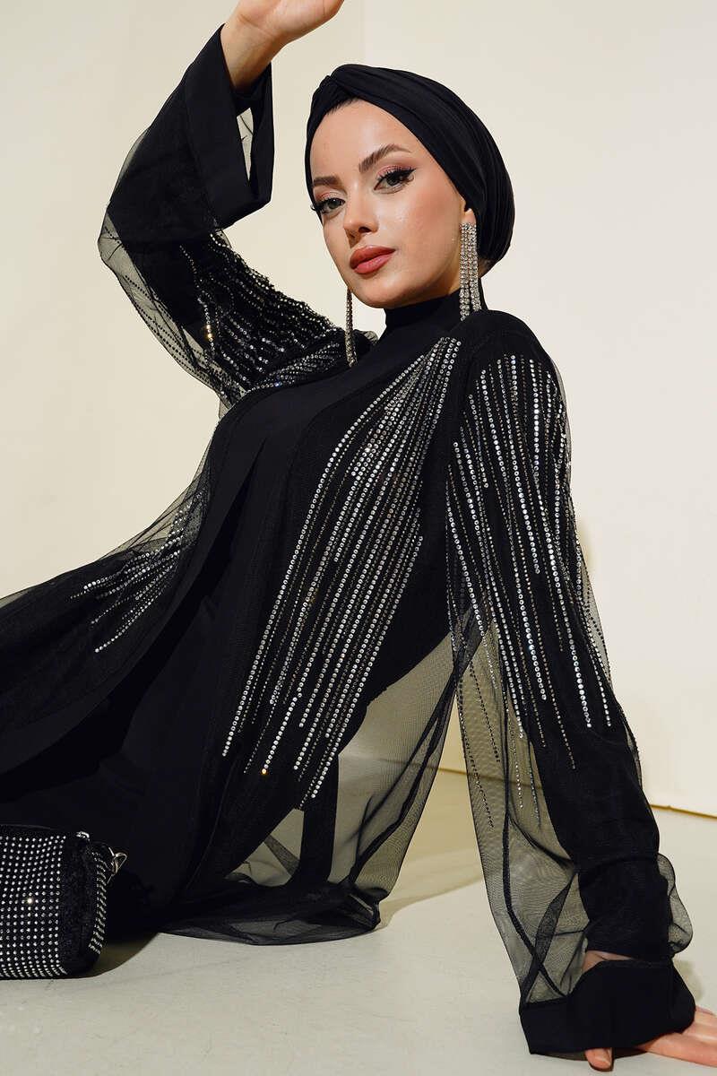 Yeni sezon abayamız şık tarzıyla sizlerle. abaya iki parçadan oluşmaktadır. . Abayamız düz ve uzun tül hırka olup taşlarla süslenmiştir. Bilekleri ribanalıdır. Kendi kumaşından kemeri bulunmaktadır. Şık ve zarif görünümüyle abayamız özel günlerinizin gözdesi olacak.