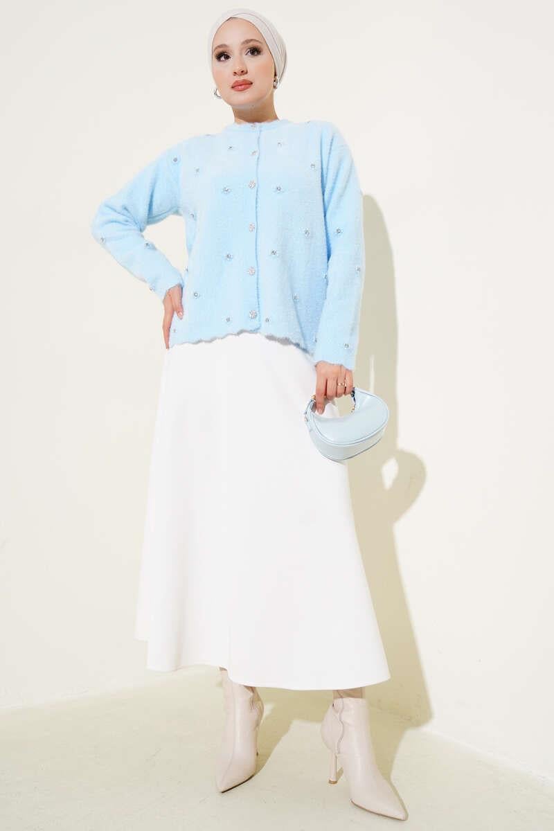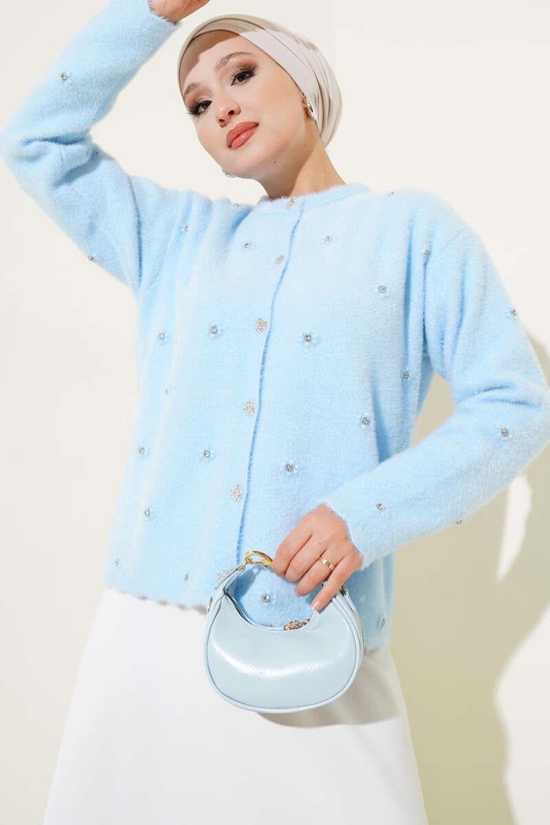 Taşlı Çiçek Düğmeli Sakallı Hırka Mavi (0853-2408-672844)