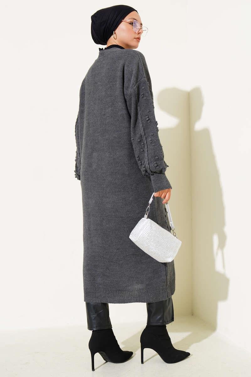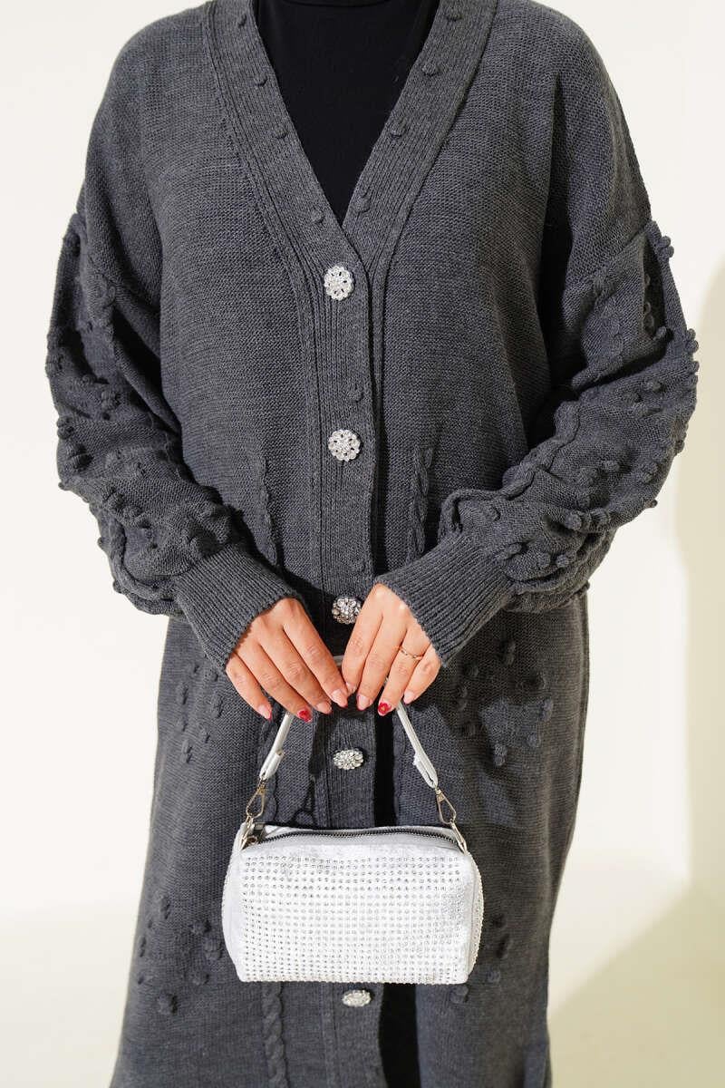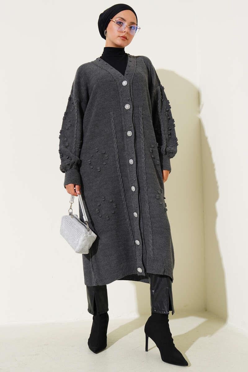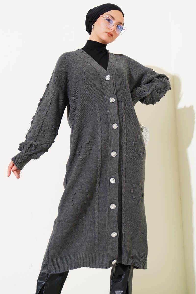 Taşlı Düğmeli Triko Hırka Füme (0875-4098-675788)