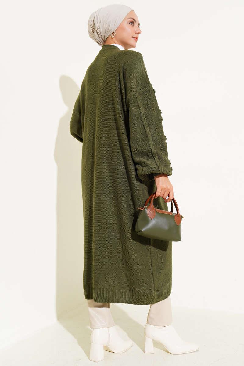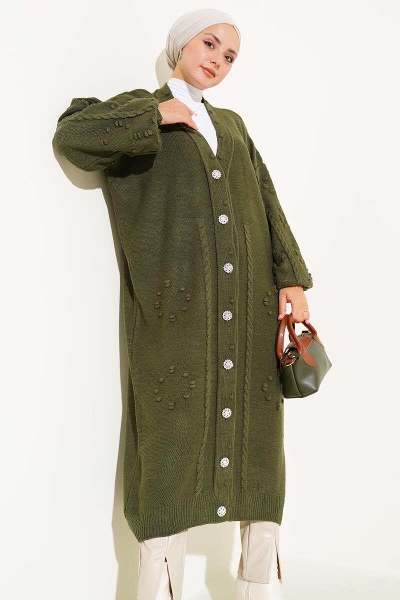 Taşlı Düğmeli Triko Hırka Haki (0875-4098-675789)