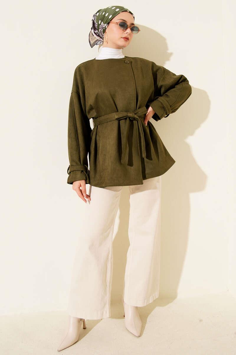 Tek Düğmeli Kuşaklı Süet Ceket Haki (0537-4526-688634)