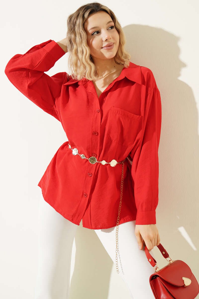 Yaka Cepli Oversize Gömlek Kırmızı (0532-6977-744770)